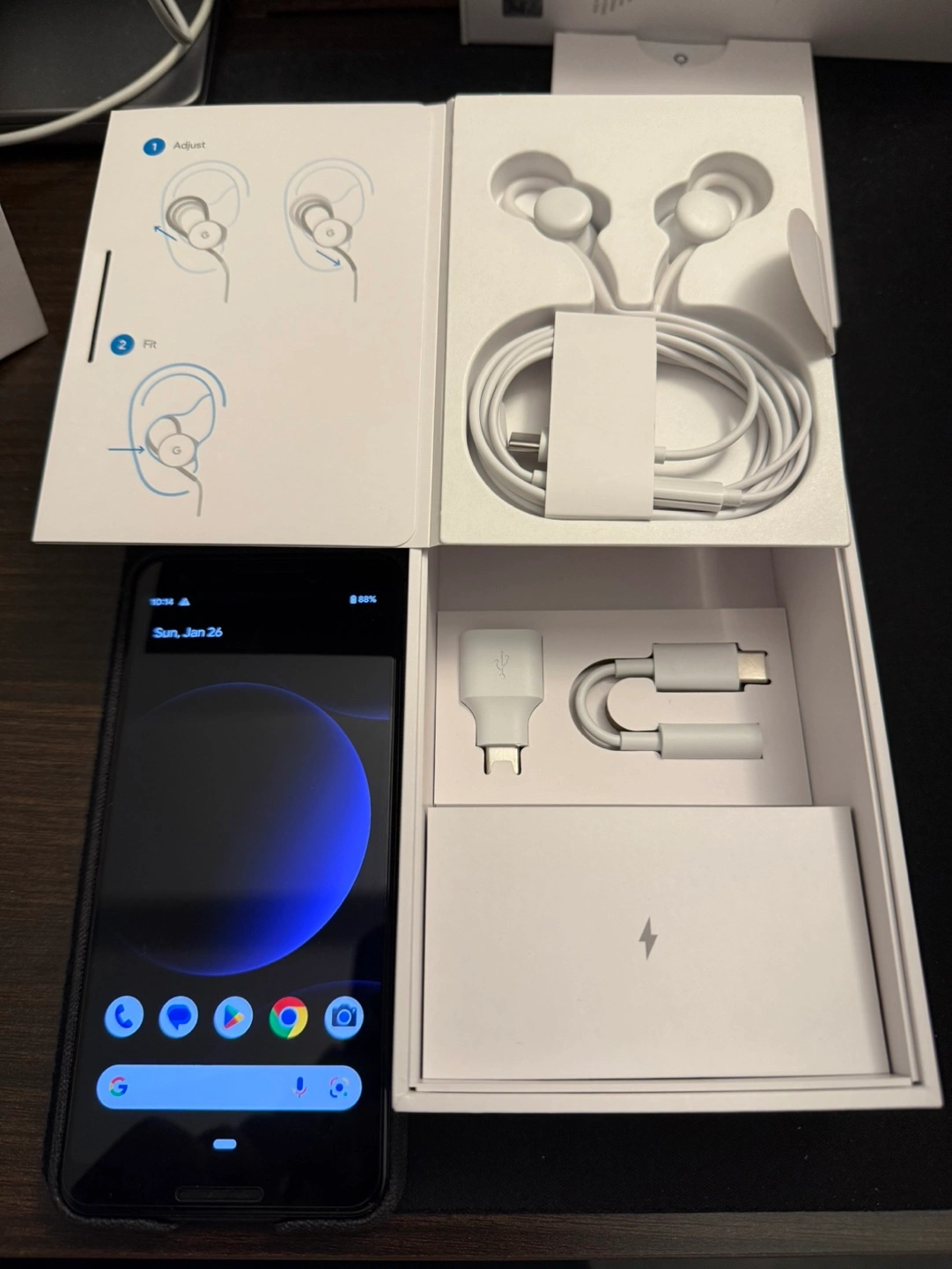 Includes original box and all accessories. Earphones and power adapter are brand new and never been used. Also comes with an applied screen protector and a free genuine fabric case from Google.