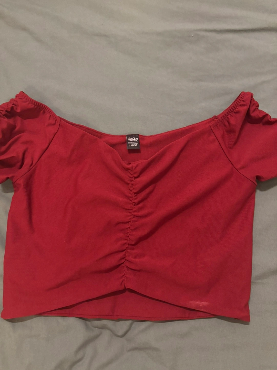 306Burgundy coloured crop top. Off-the-shoulder style. Short sleeves. Slightly ruched at the centre. Size large.
