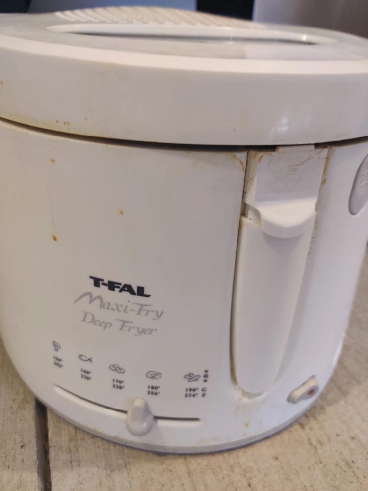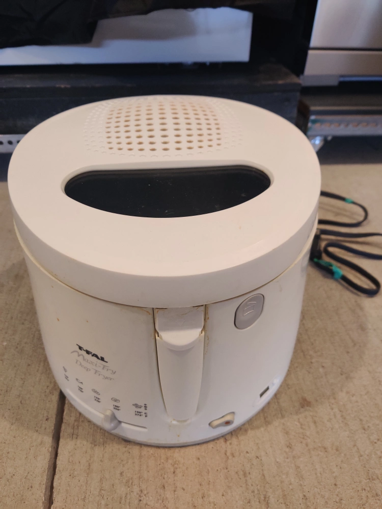 Used T-Fal Maxi-Fry deep fryer. White colour. Includes basket. Shows some signs of use.