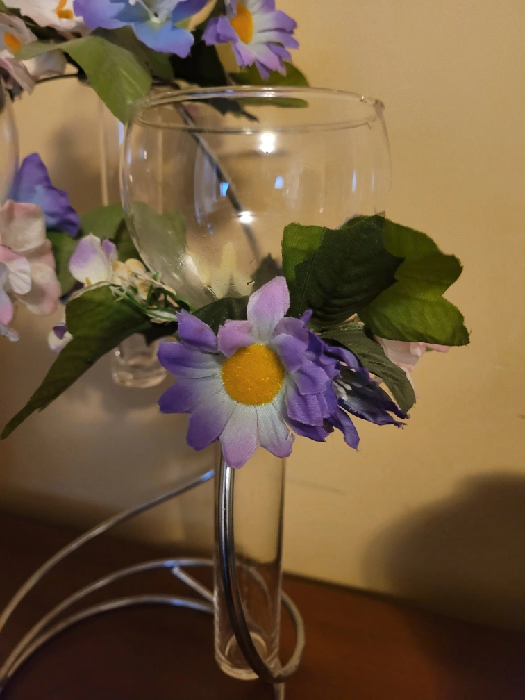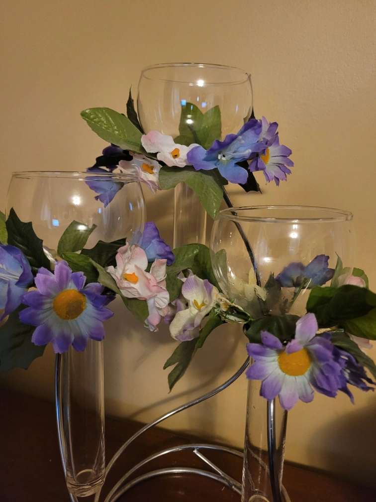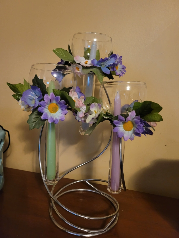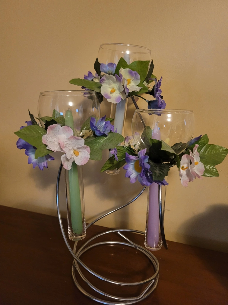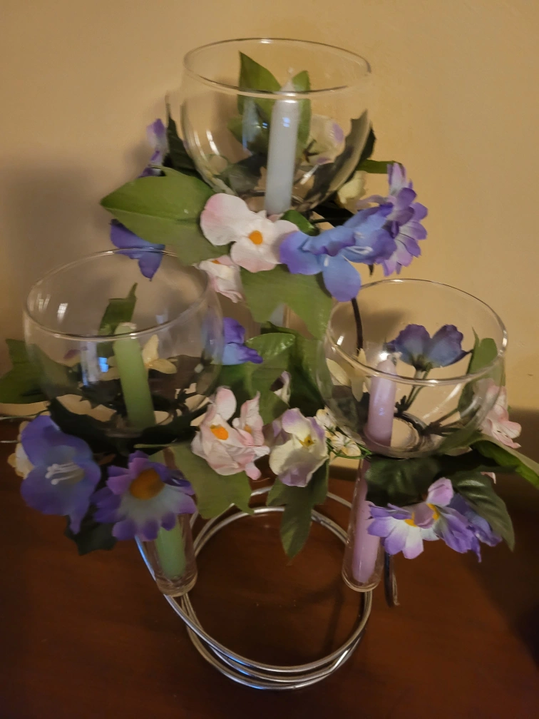 Beautiful centerpiece. Features three glass votive holders with artificial flowers. Metal stand; candles included. Can change flowers to the colors of your choice.
