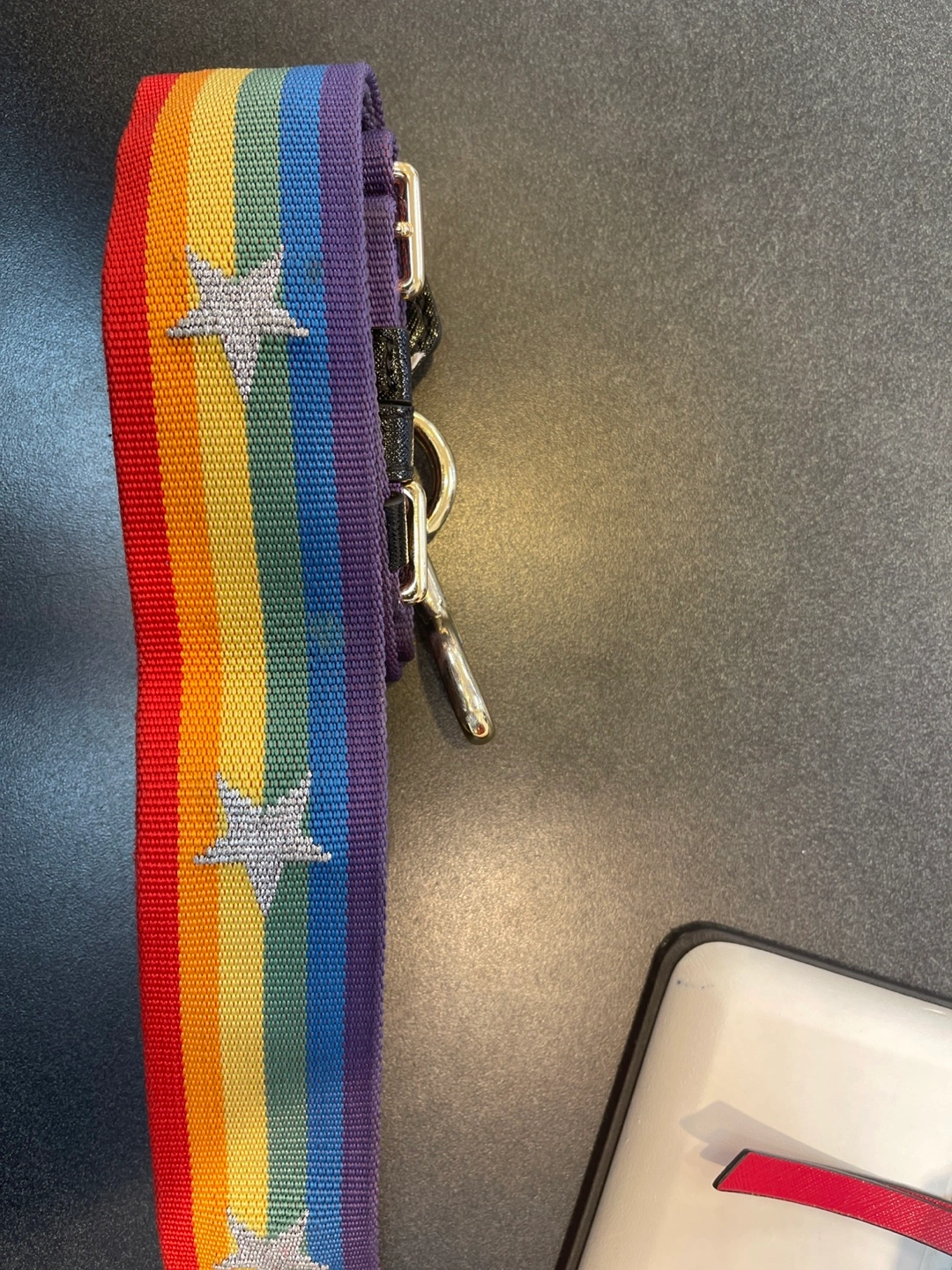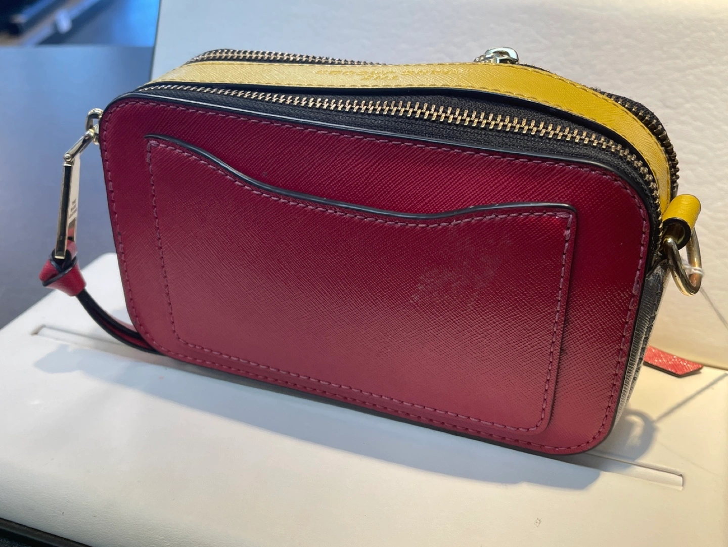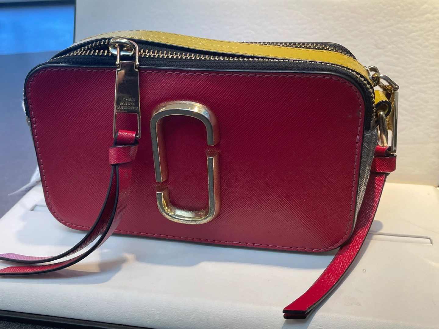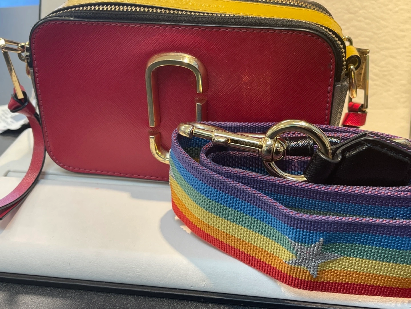 Marc Jacobs Snapshot camera bag. Red, yellow, and black. Gold hardware. Includes rainbow strap with stars. Small crossbody bag.
