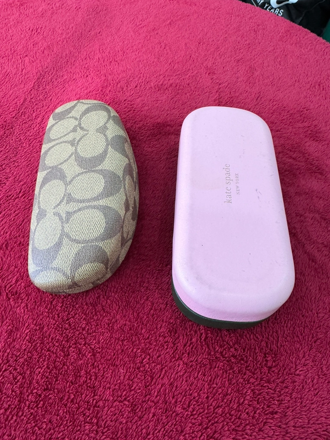 Set of two gently used eyeglass cases. One is a Coach case with a signature monogram print. The other is a pale pink Kate Spade case. Both are in good condition, suitable for storing and protecting eyeglasses.5$ each