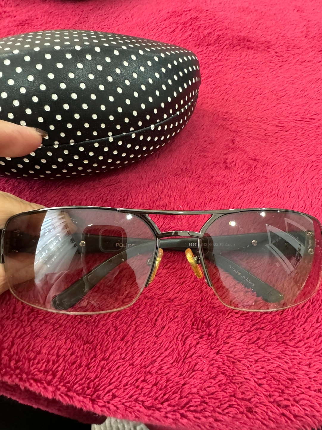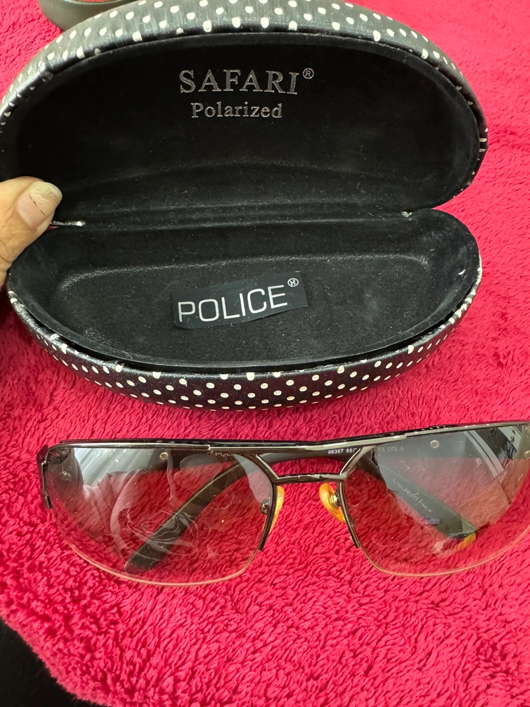 Pre-owned Police brand sunglasses. Safari polarized lenses. Comes with a case. Metal frame. Excellent condition.