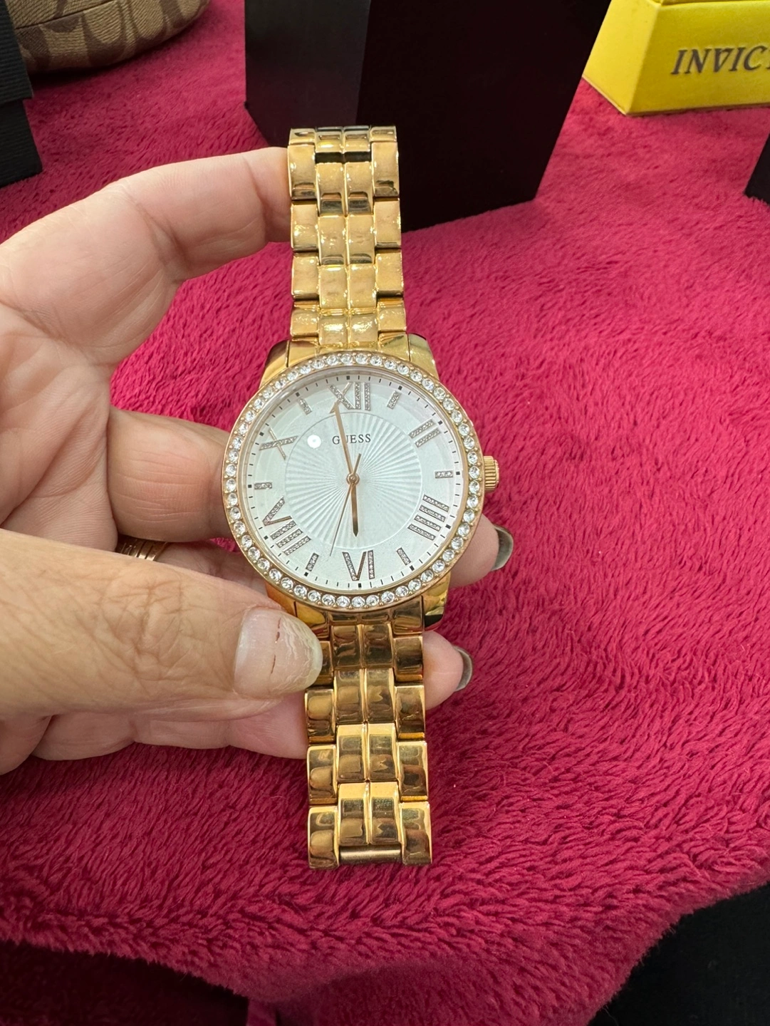 Rose gold-toned stainless steel bracelet. White face with Roman numerals and crystal accents. Quartz movement. Pre-owned.