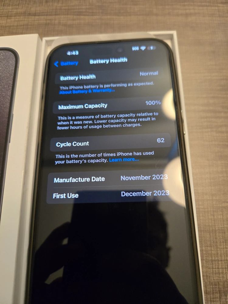 No defects. 100% battery health capacity. 62 cycle count. Manufactured November 2023. First used December 2023. Includes original box.