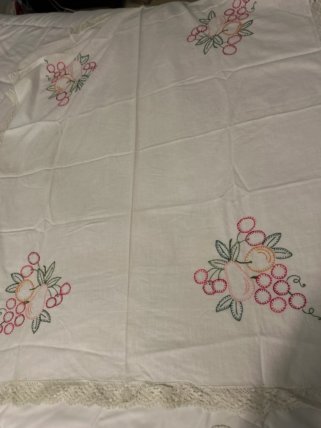 Lovely vintage tablecloth. Features hand embroidery of pears, cherries, and grapes. Off-white linen with crocheted lace trim. Beautiful detail. Excellent for adding a touch of vintage charm to your home.