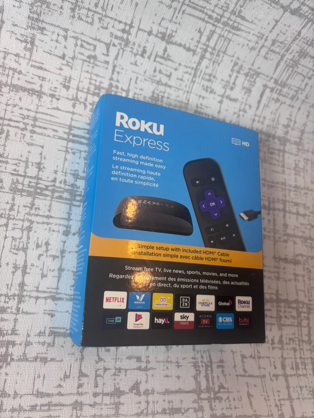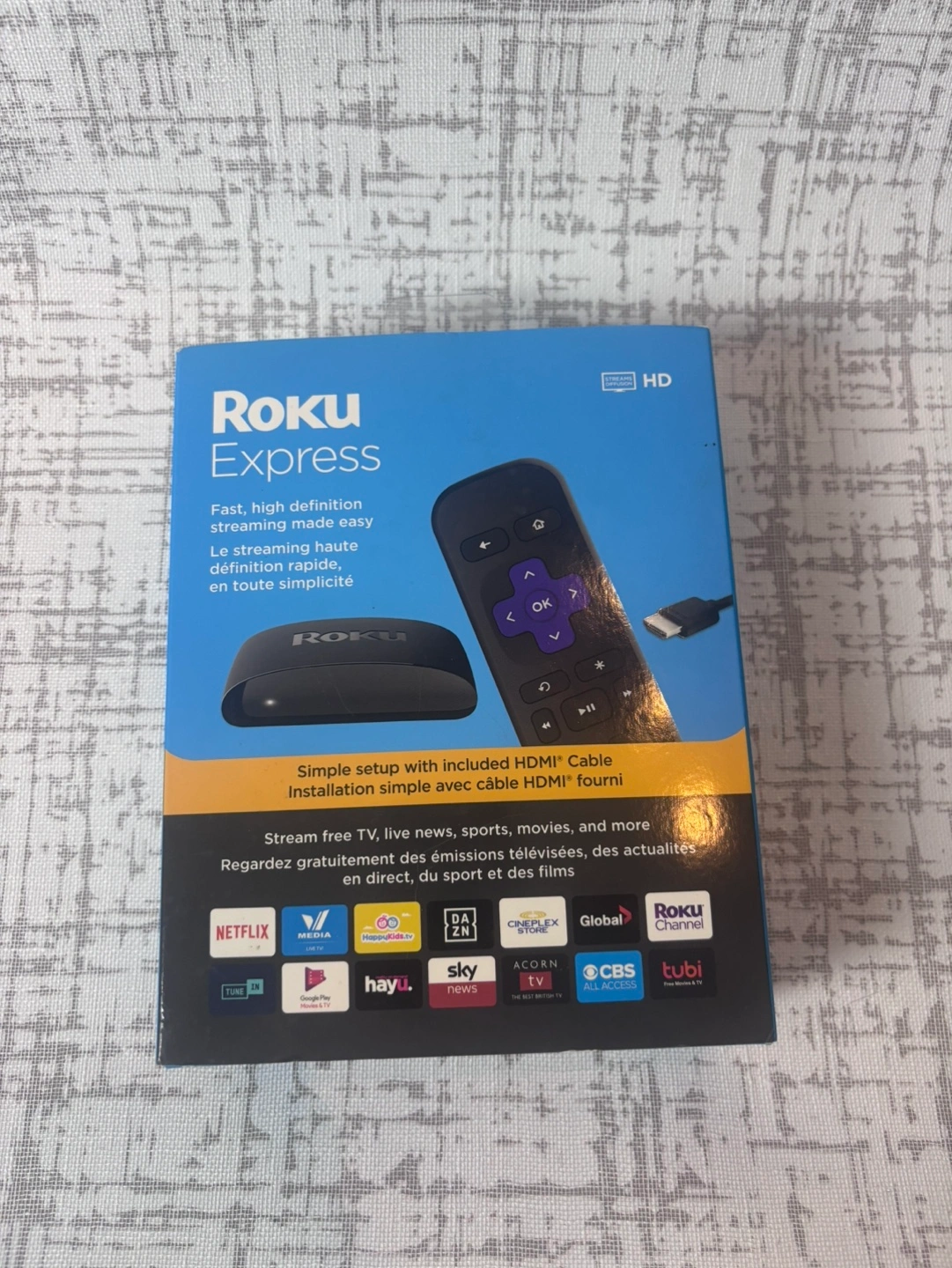 Brand new, unopened Roku Express. Includes HDMI cable and remote. Stream free TV, live news, sports, movies, and more. Easy setup. High definition streaming.