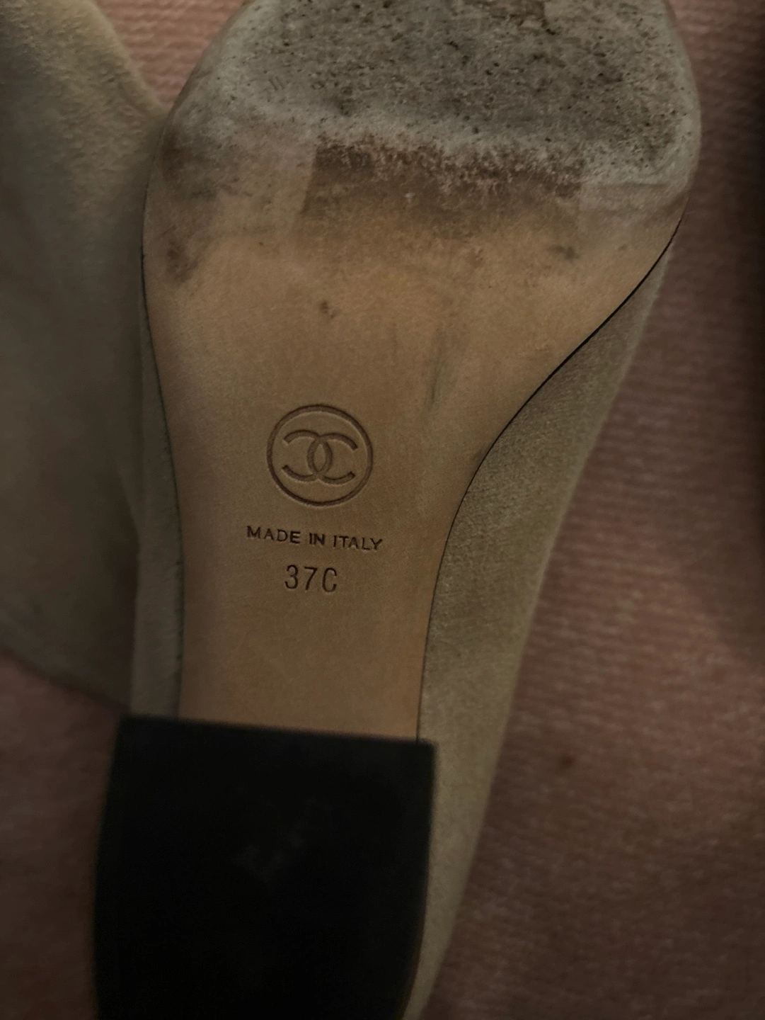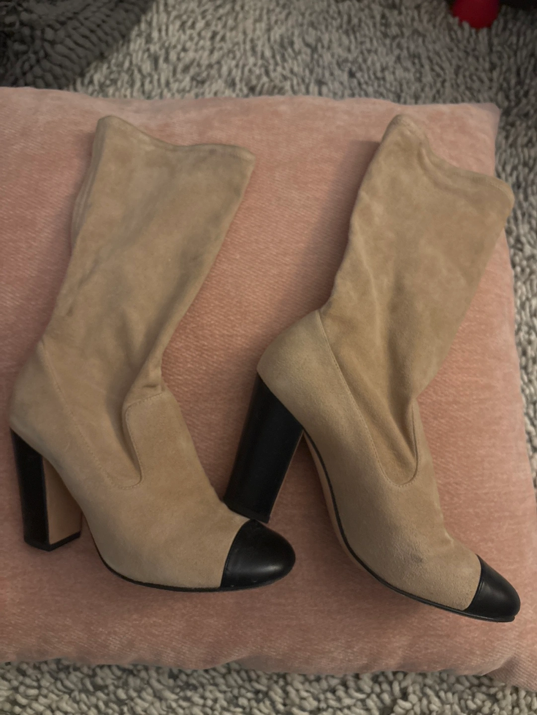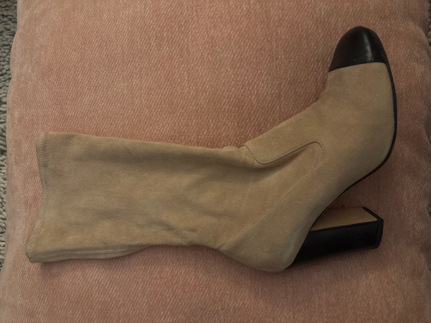 Beautiful beige suede boots. Block heel. Cap toe. Made in Italy. Size 37C.