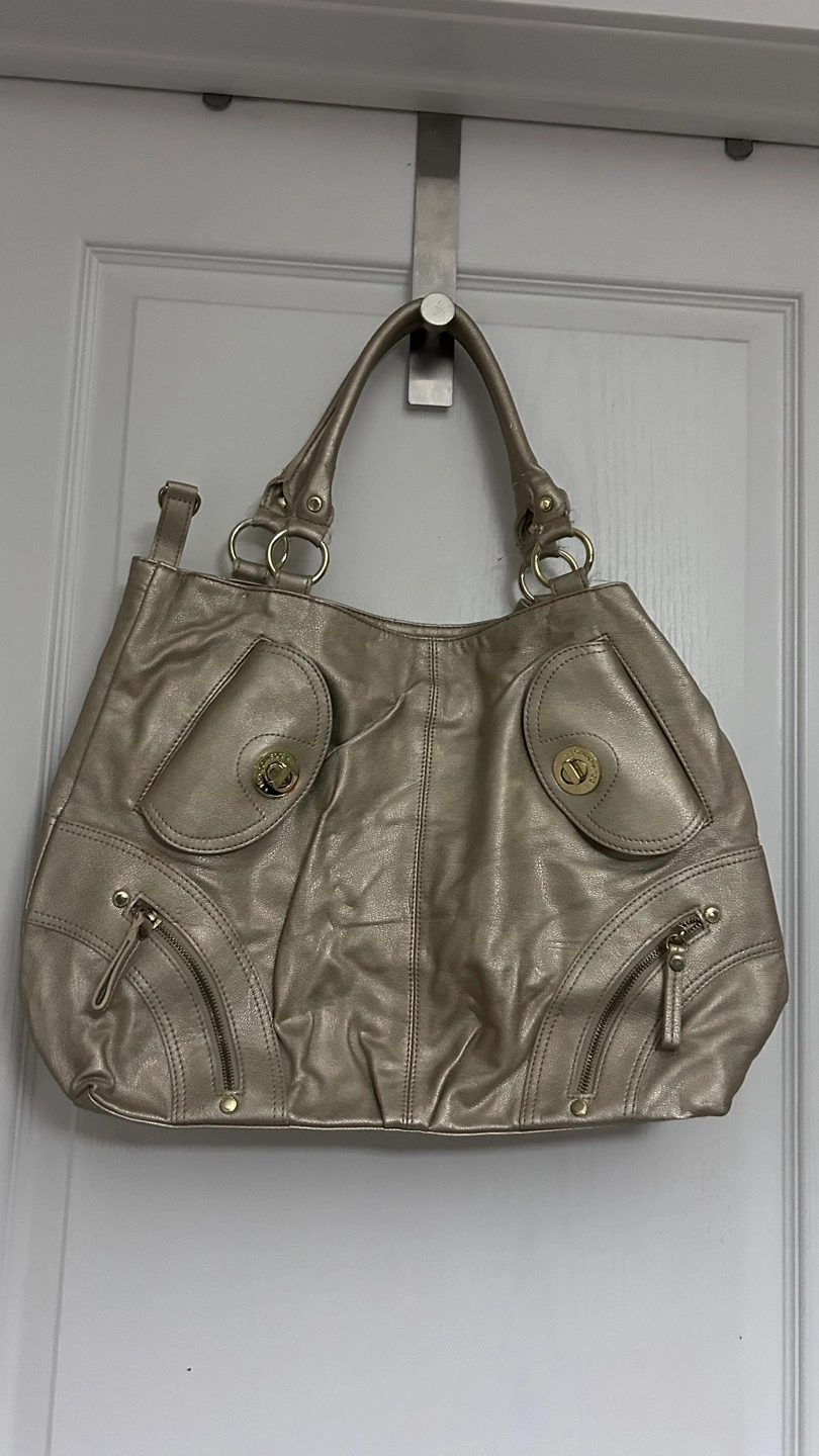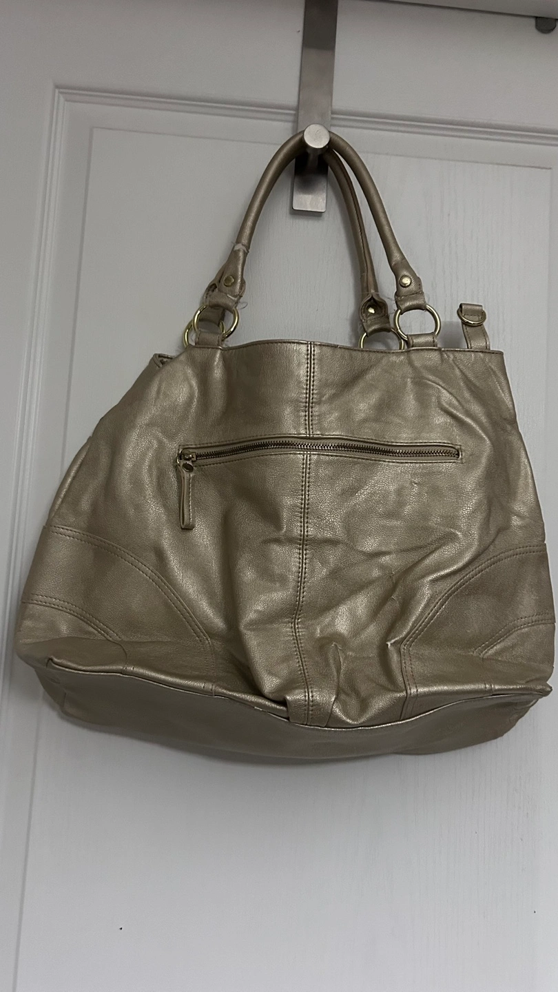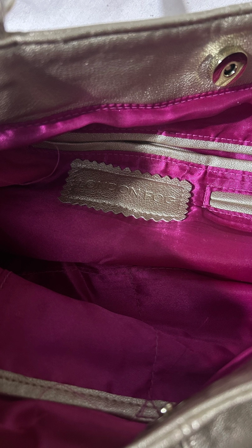 Large gold metallic handbag. Features two top handles, zipper closure, and multiple pockets. Interior lining is fuchsia pink.