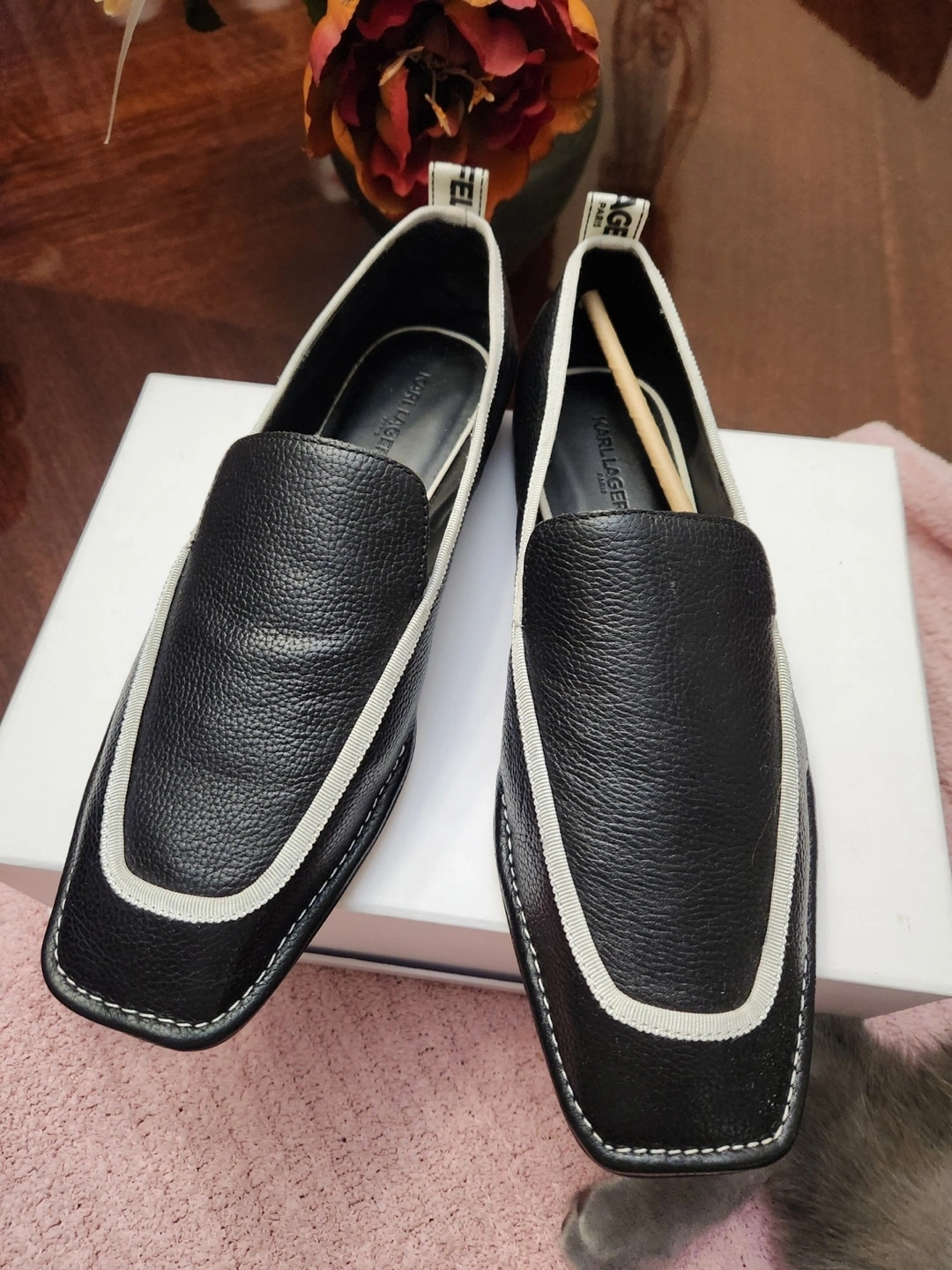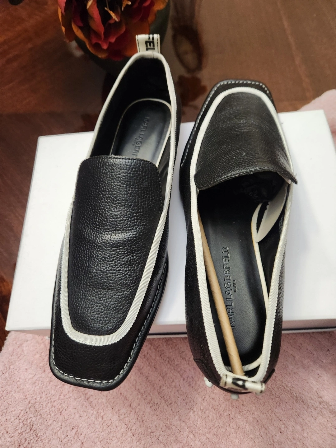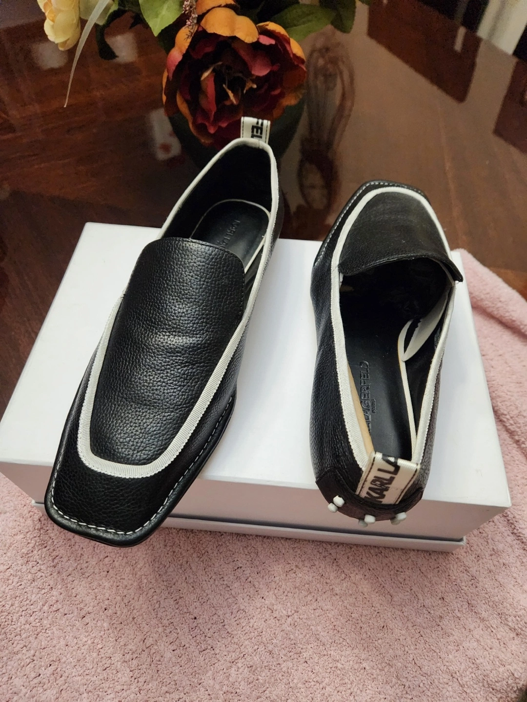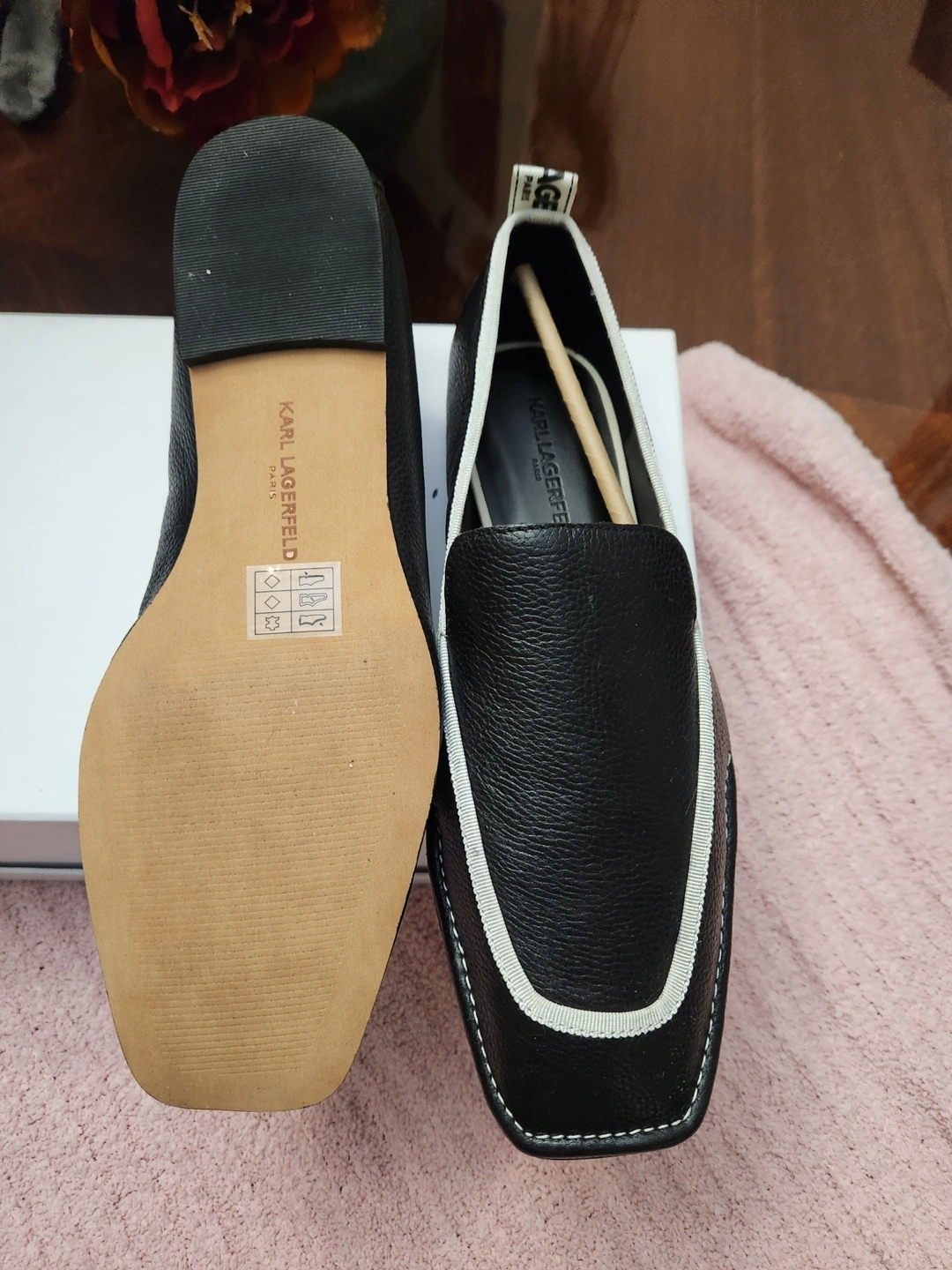 Black leather loafers by Karl Lagerfeld. Square toe. Off-white piping detail. Size 9M.