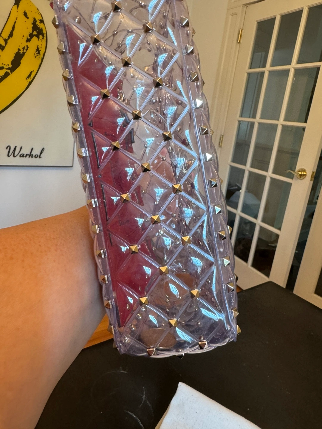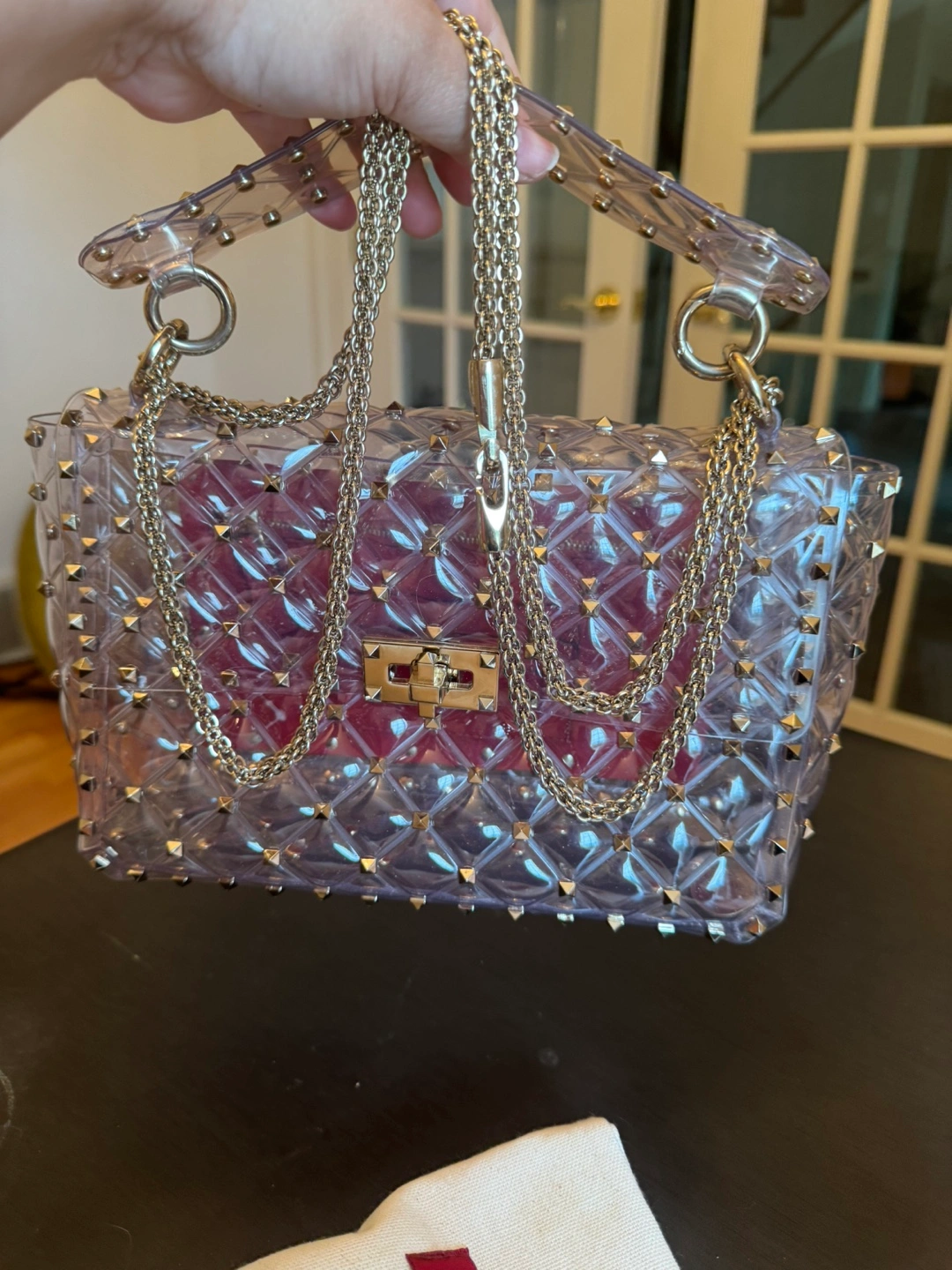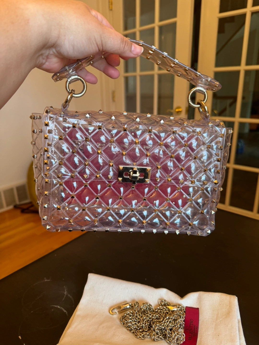 Pre-owned Valentino Garavani Rockstud transparent PVC shoulder bag. Features gold-tone hardware, quilted design, and removable chain strap. retails for over $4000
