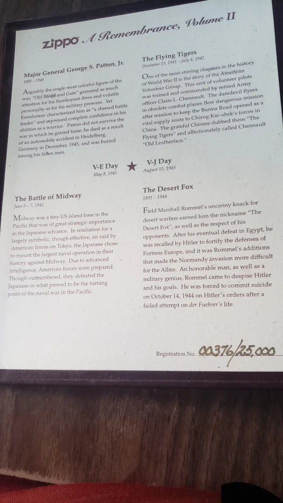 Five brass Zippo lighters in collector's box. Each lighter features unique World War II imagery. Includes informational booklet. very rare only 25,000 never made and this is number 376/