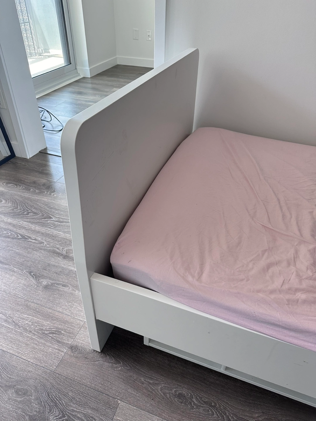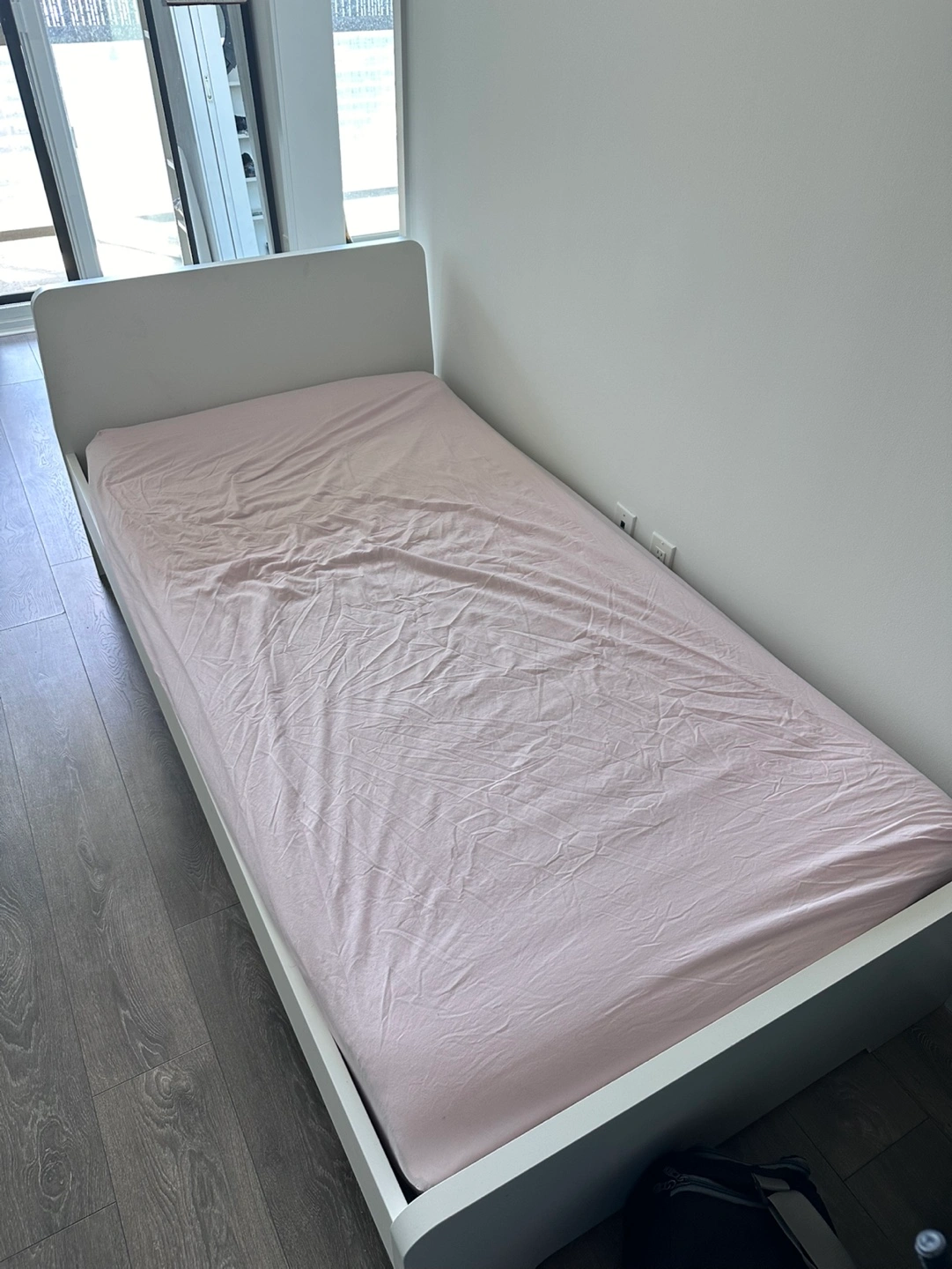 Can be bought separately too!!! Bedframe: Askvoll twin bedframe from Ikea with wooden slats - individual price 130$ to take Mattress: Morgedal foam mattress (good back support) - individual price 110$ to take along with three bedsheets (light pink, dark grey and white- each bedsheet 5$) Bought only a year ago. Gently used in a home which is smoke free, pet free and bugs free. Need it gone ASAP Pick up only near Duke of Kent!