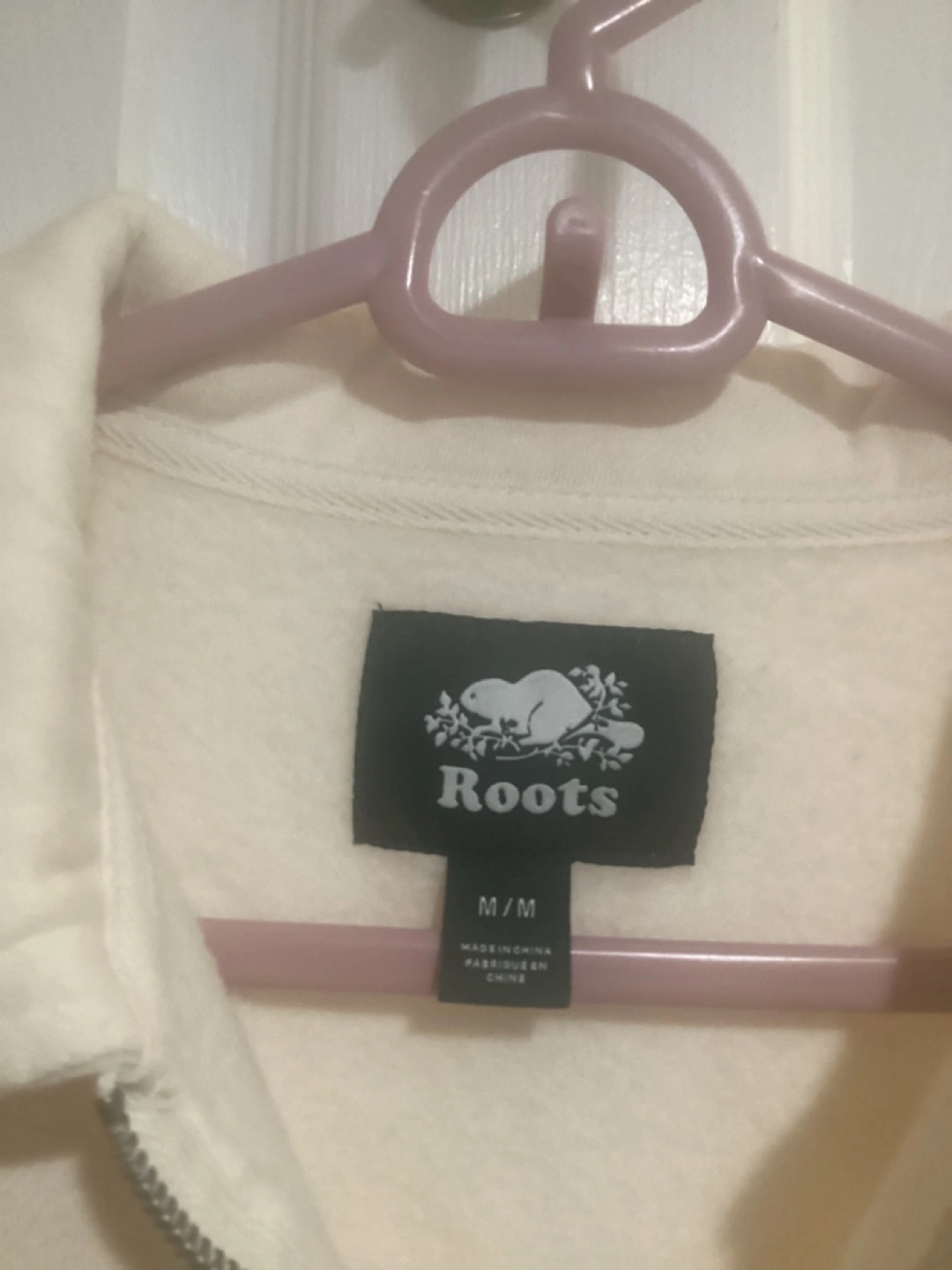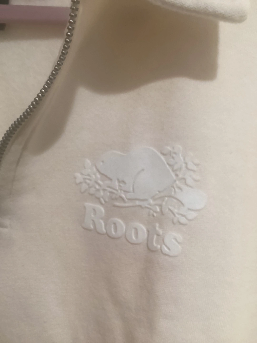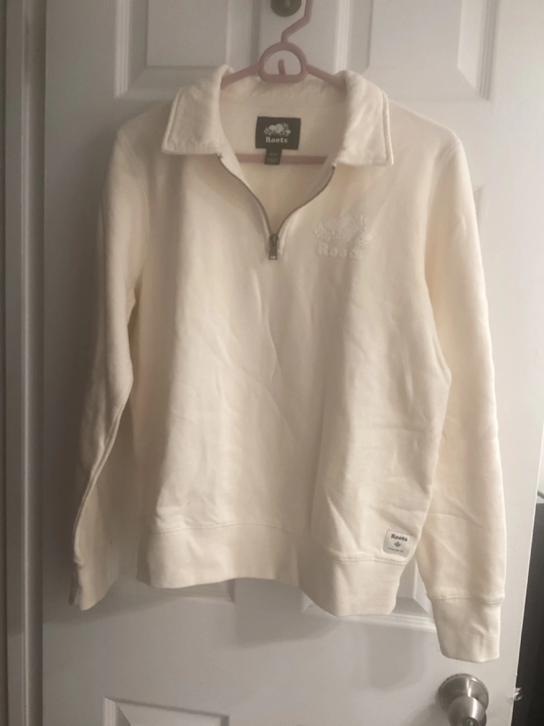 Cream-coloured Roots quarter-zip sweatshirt. Size medium. Features embroidered logo. Long sleeves. Classic style