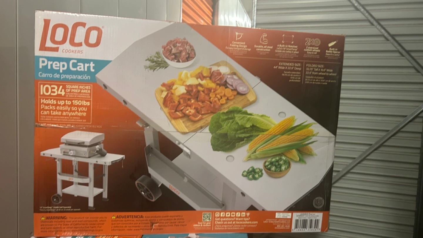 Portable prep cart, folds for easy storage. Features built-in bottle opener, tool hooks, paper towel rack, and condiment rack. Two oversized wheels for easy mobility. Holds up to 150 lbs. Great for outdoor cooking or entertaining.