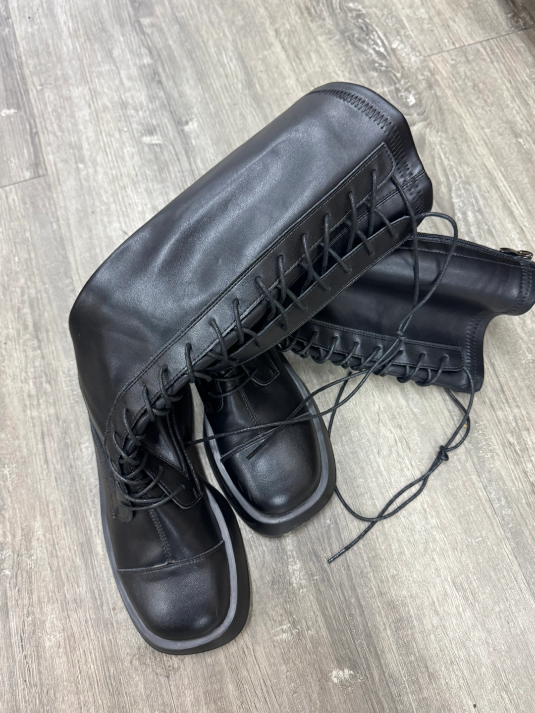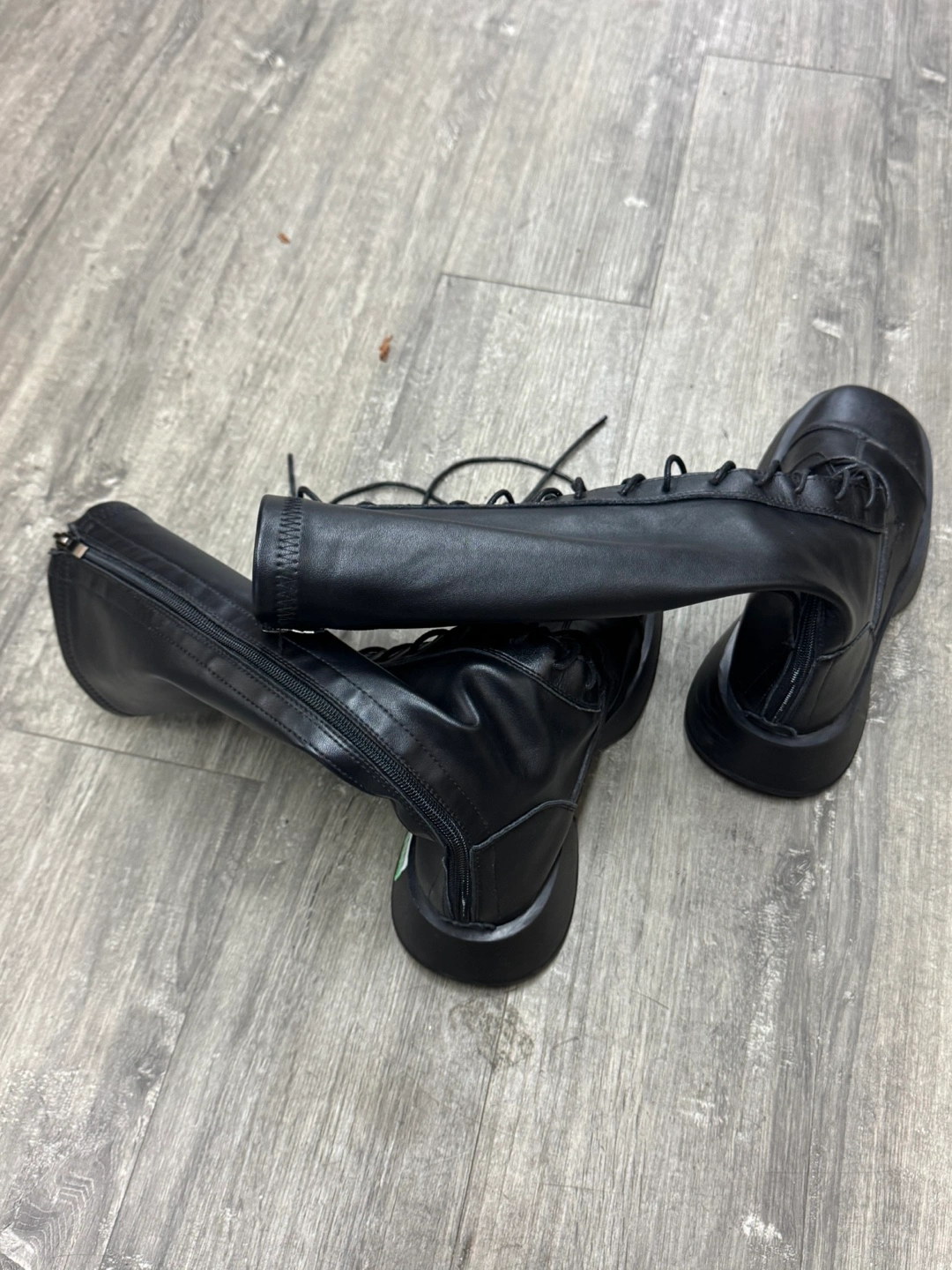 Stylish black leather knee-high boots. Feature lace-up front and chunky platform sole. Side zipper for easy on and off. Great for fall and winter.