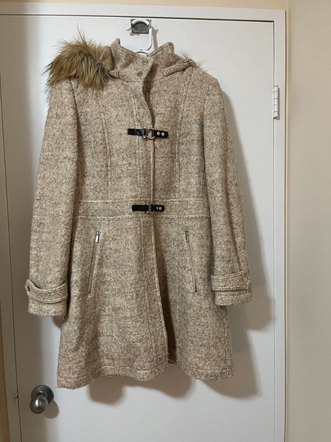Warm beige wool-blend coat. Features a faux fur lined hood and toggle closures. Two zippered pockets. Great for colder weather.