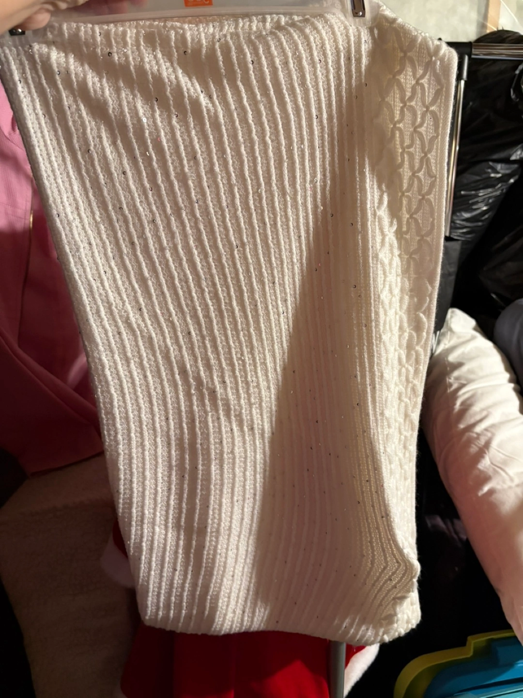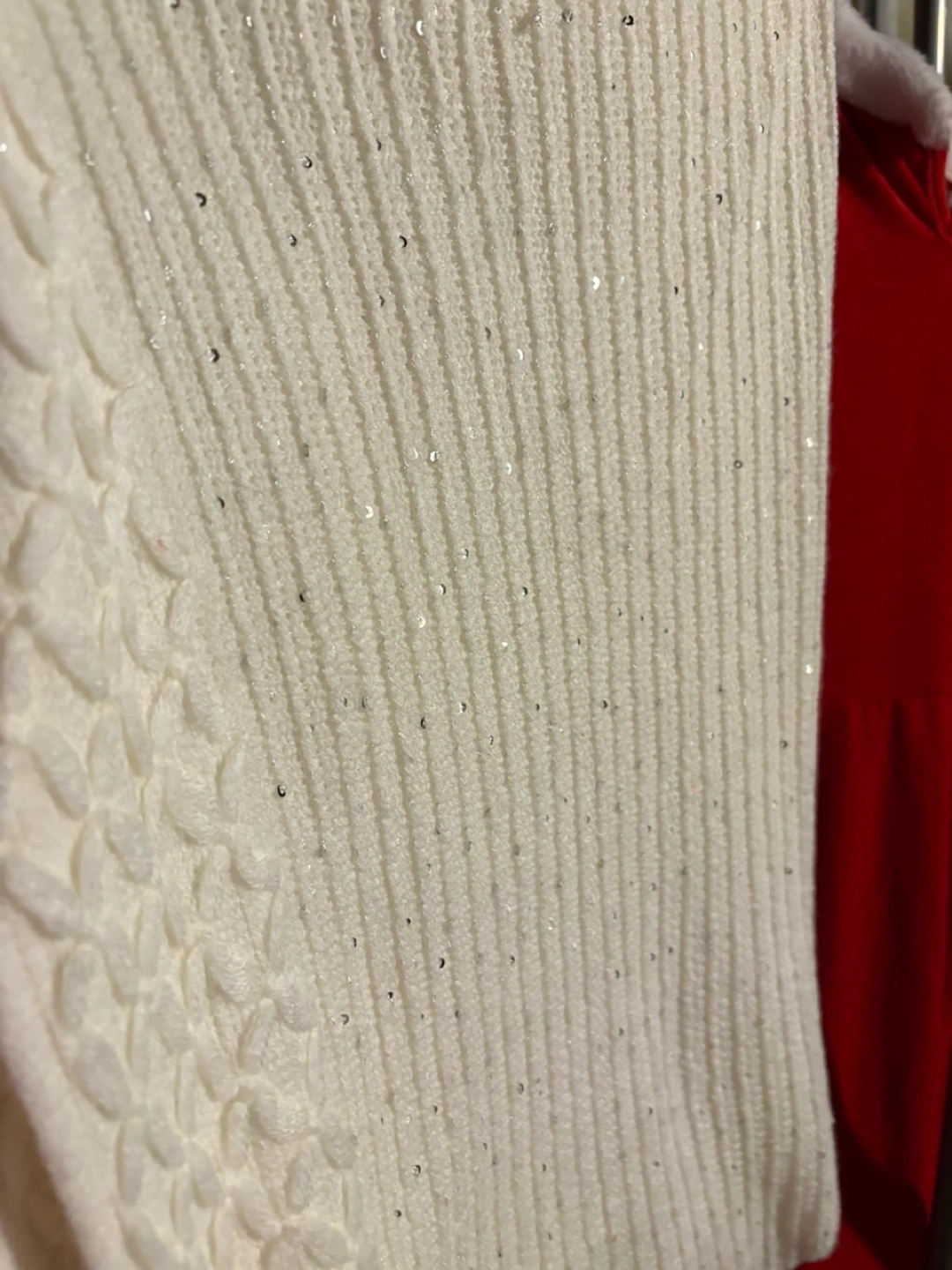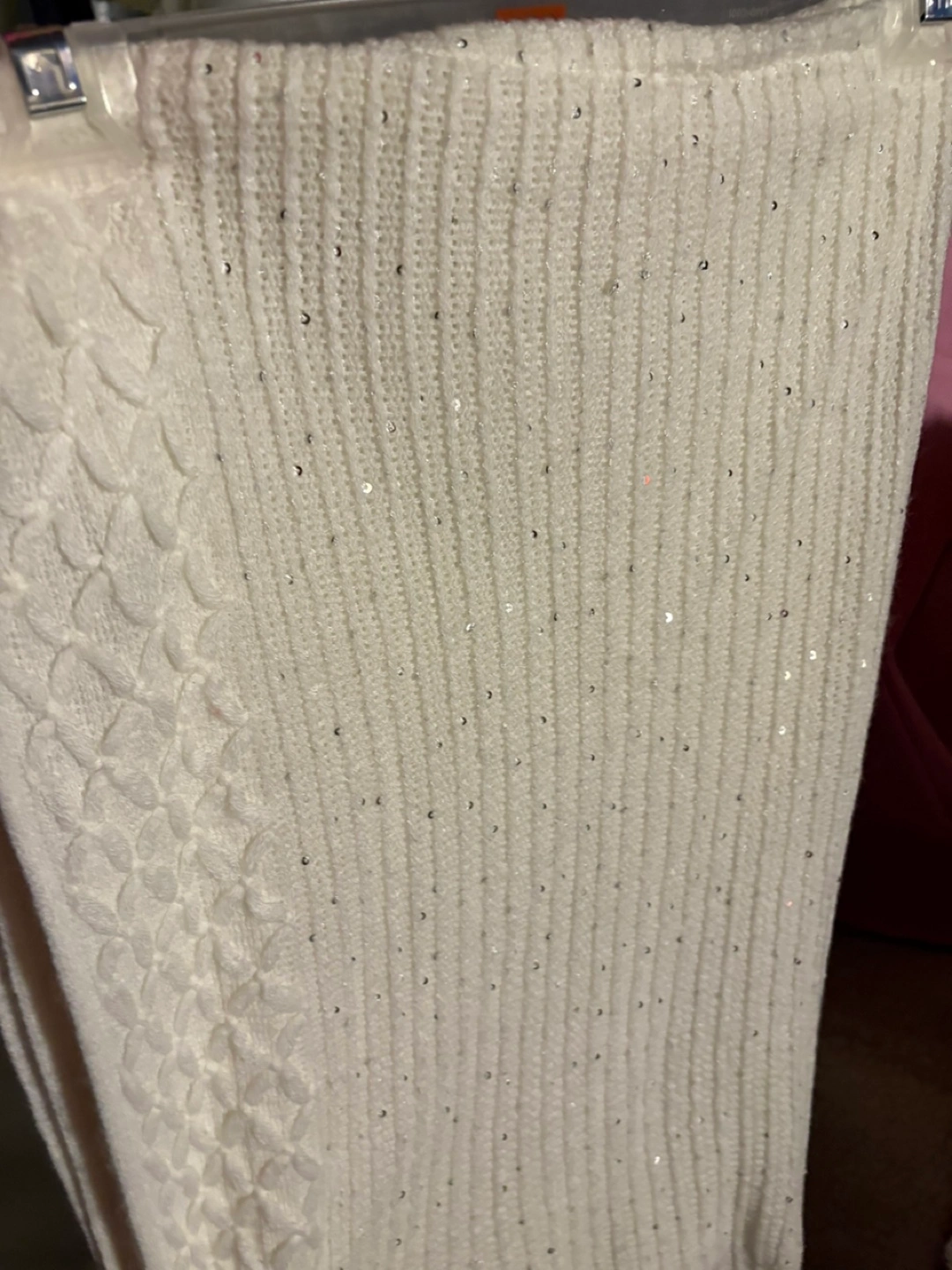 Beautiful cream-coloured knitted circular scarf. Features a cable knit pattern and silver sequins throughout. Soft and warm, perfect for winter. Lightweight and easy to style.