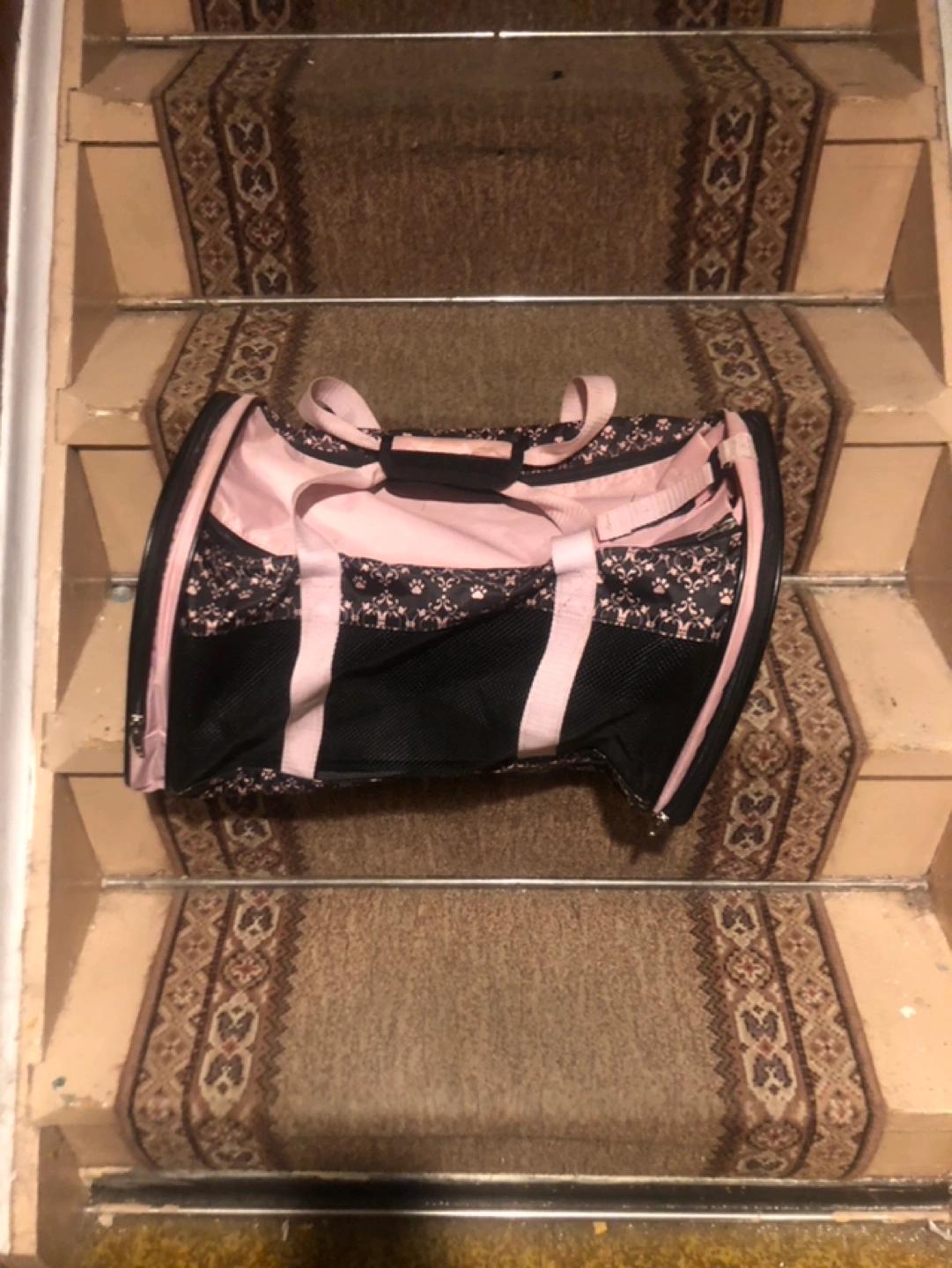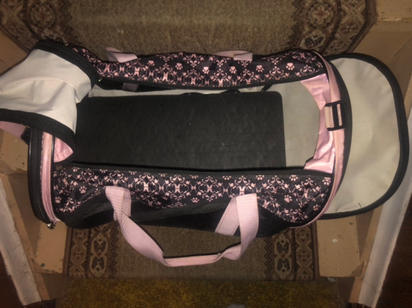 Pink and black pet carrier. Soft-sided design. Features mesh windows and a zippered closure. Includes a small removable mat.