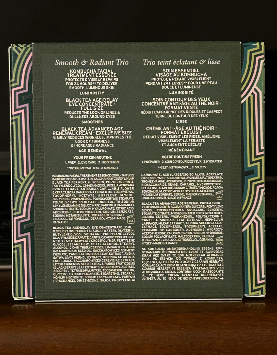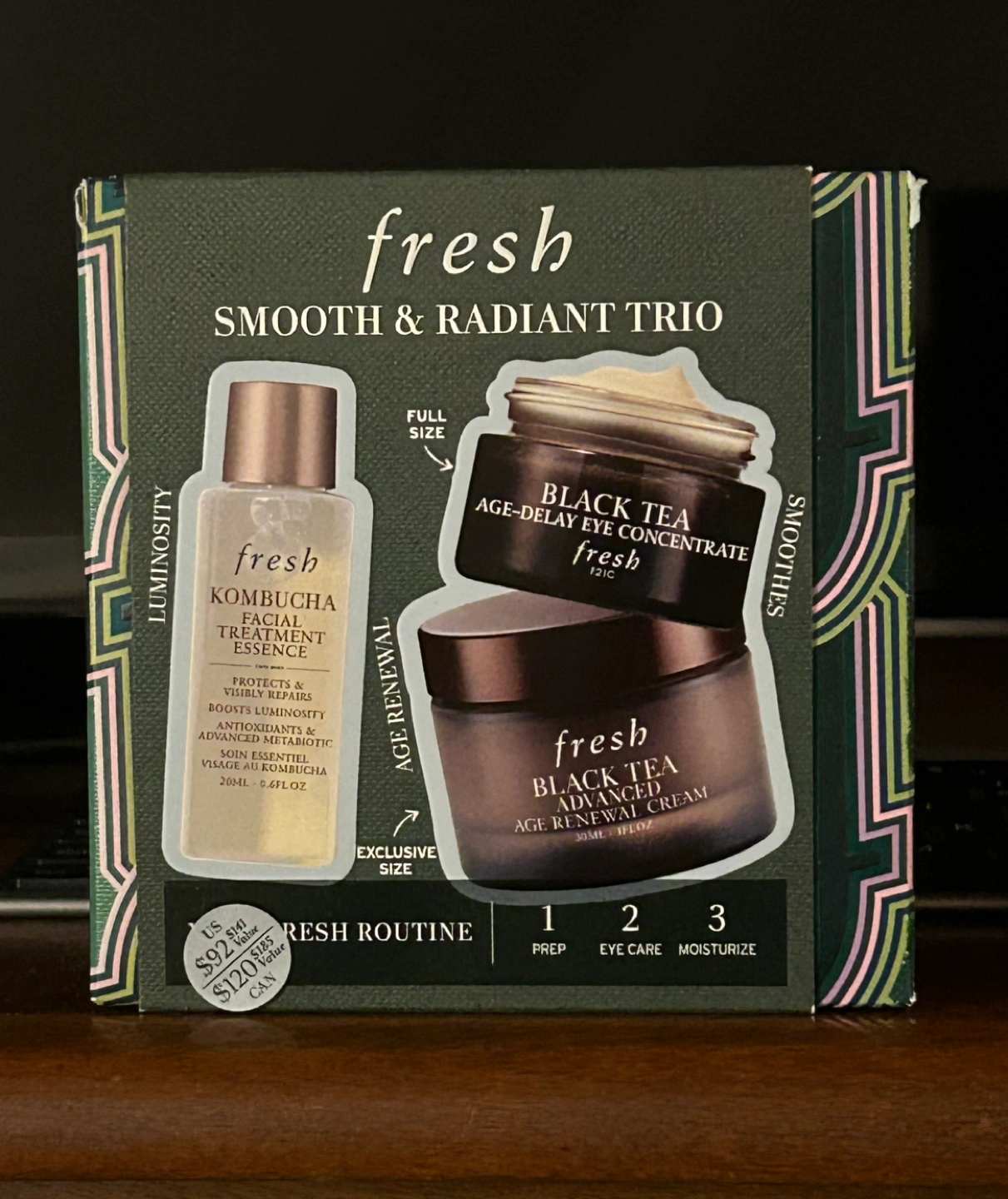 Brand new, unopened Fresh Smooth & Radiant Trio. Includes Kombucha Facial Treatment Essence, Black Tea Age-Delay Eye Concentrate, and Black Tea Age-Renewal Cream. Full-size and travel sizes included.