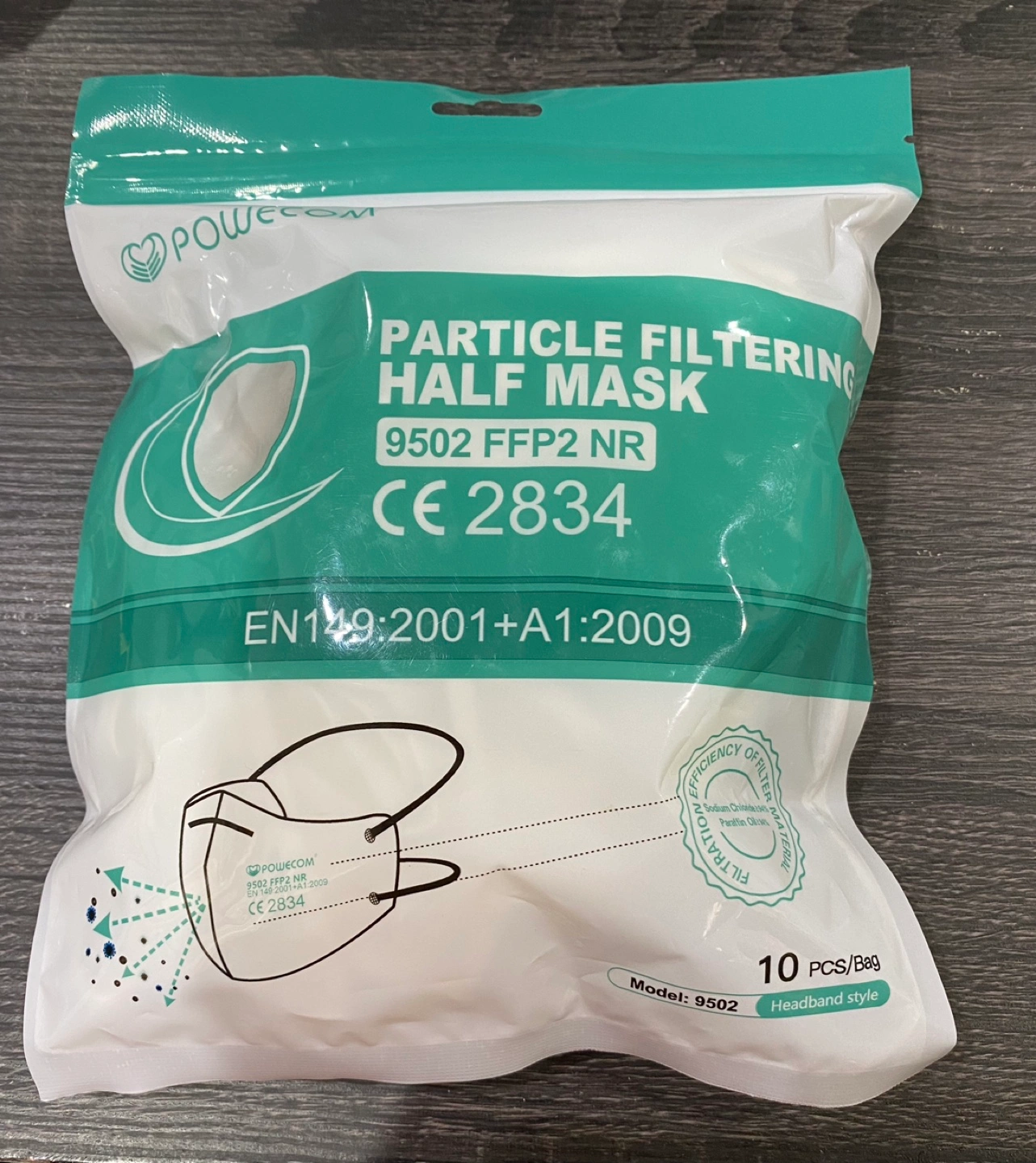 Brand new, 10-pack of Powercom particle filtering half masks. Model 9502. FFP2 NR rating. Headband style. CE 2834 certified. Meets EN149:2001+A1:2009 standards.