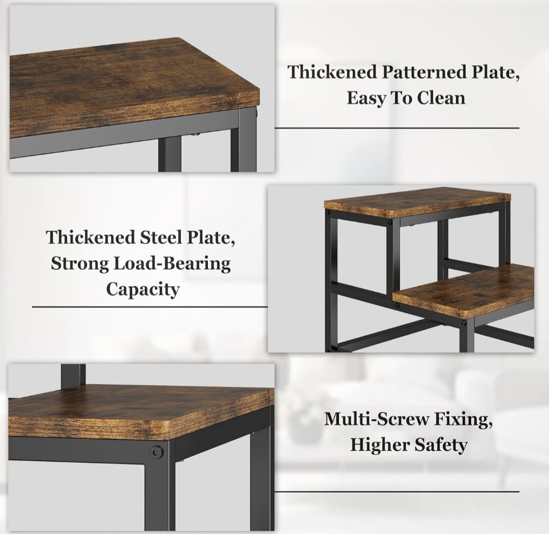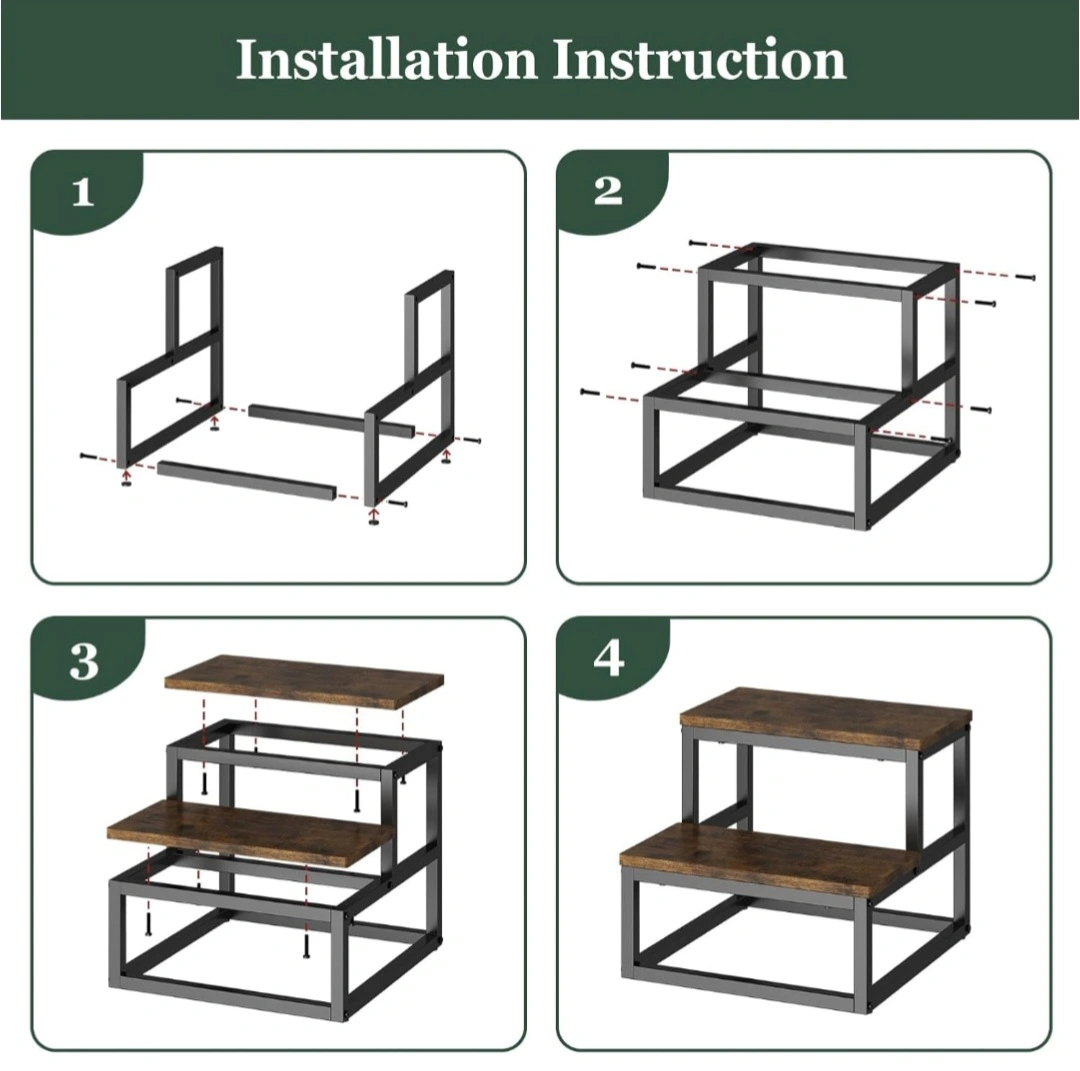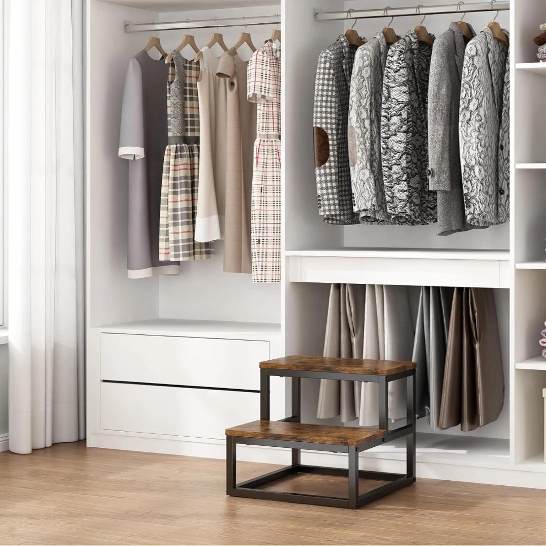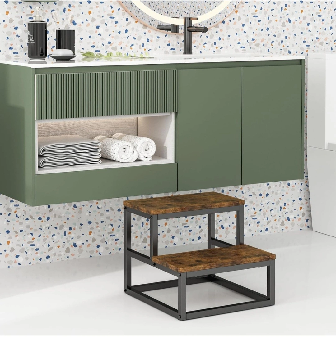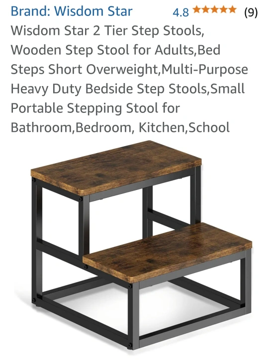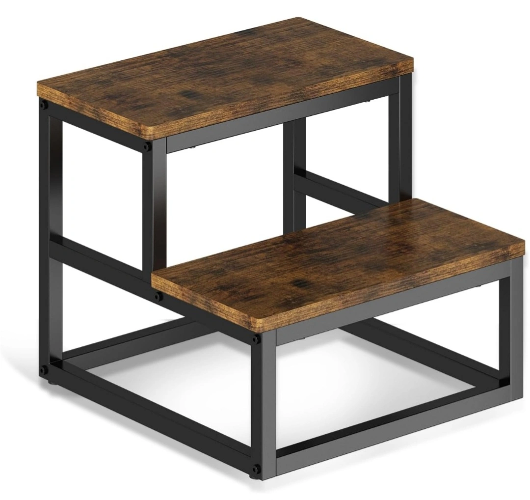 Two-tier STEP STOOL. Rustic Brown Wood Top and black METAL FRAME. Easy assembly. HEAVY-DUTY. Perfect for kitchen, bathroom, bedroom, or school etc. Portable and compact.