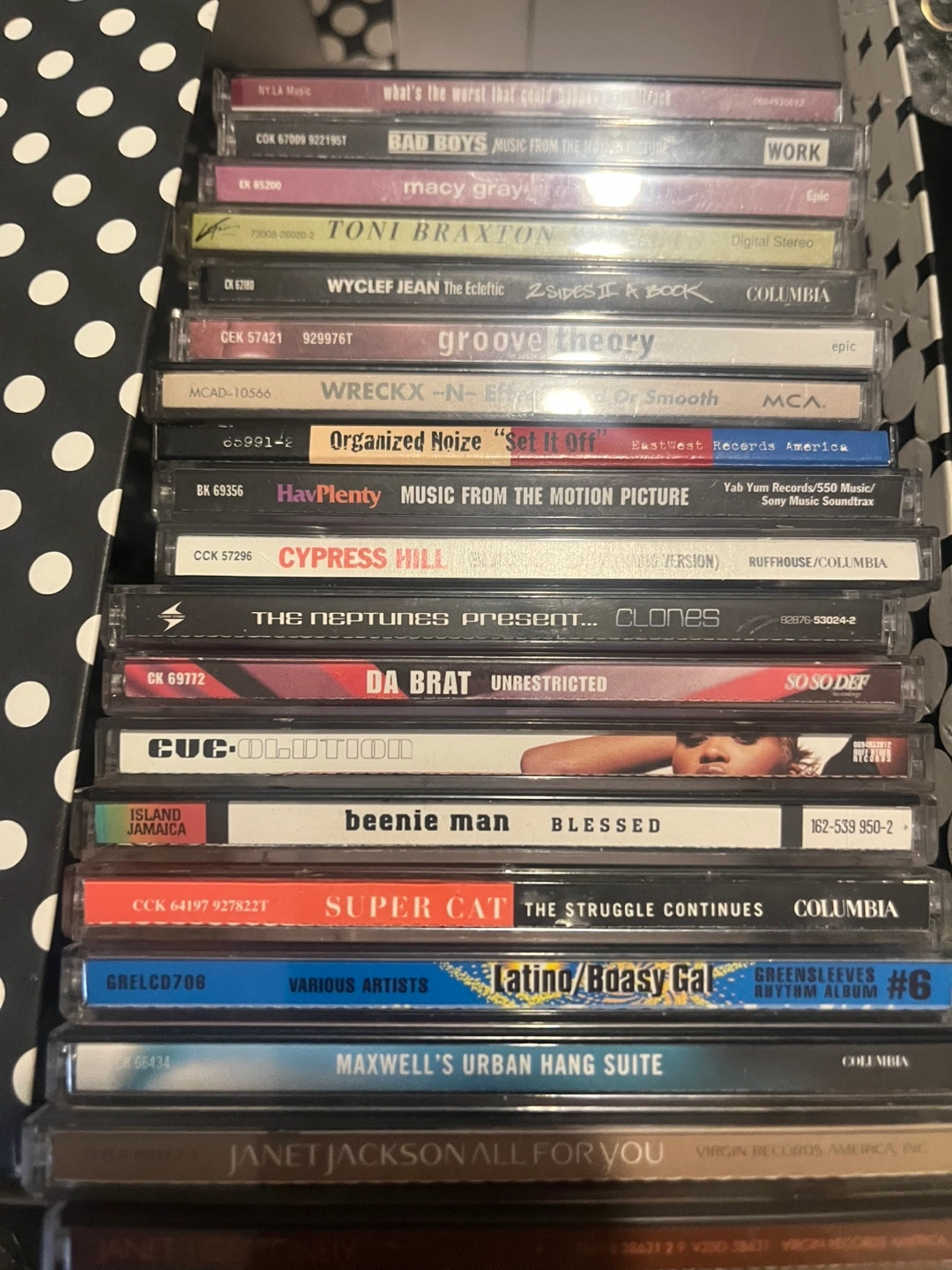 Collection of 18 pre-owned CDs. Multiple artists and genres represented. Includes titles like *Bad Boys* soundtrack, *All For You* by Janet Jackson, and more. Great for music lovers or collectors.