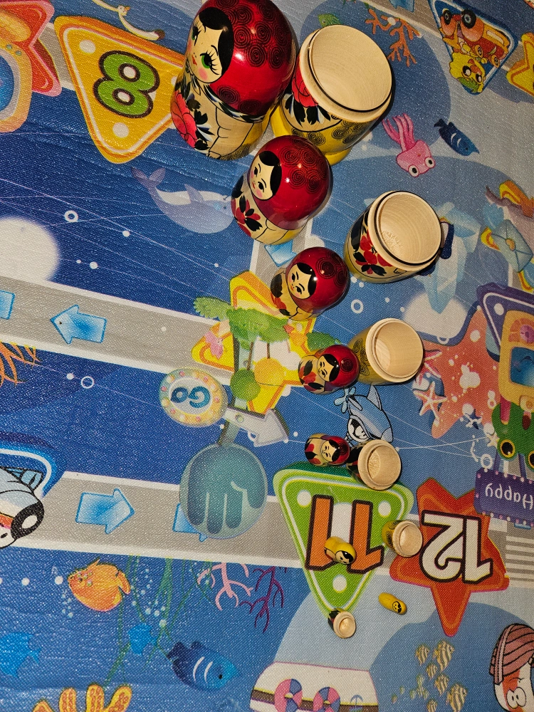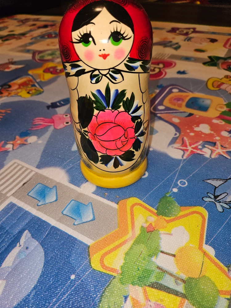 Adorable set of handcrafted Russian nesting dolls. Features colourful painted designs. Perfect collectible or unique gift. Seven dolls total, varying sizes.