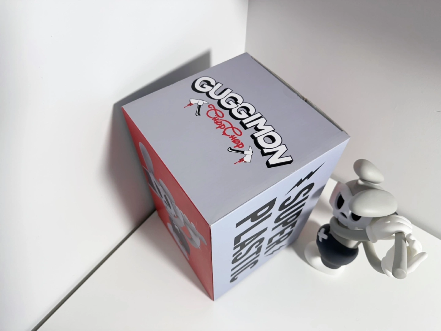 Guggimin x Superplastic Collectible figure. Grey and white colour scheme. Comes in original box. Part of a collaboration between Guggimon and Superplastic.