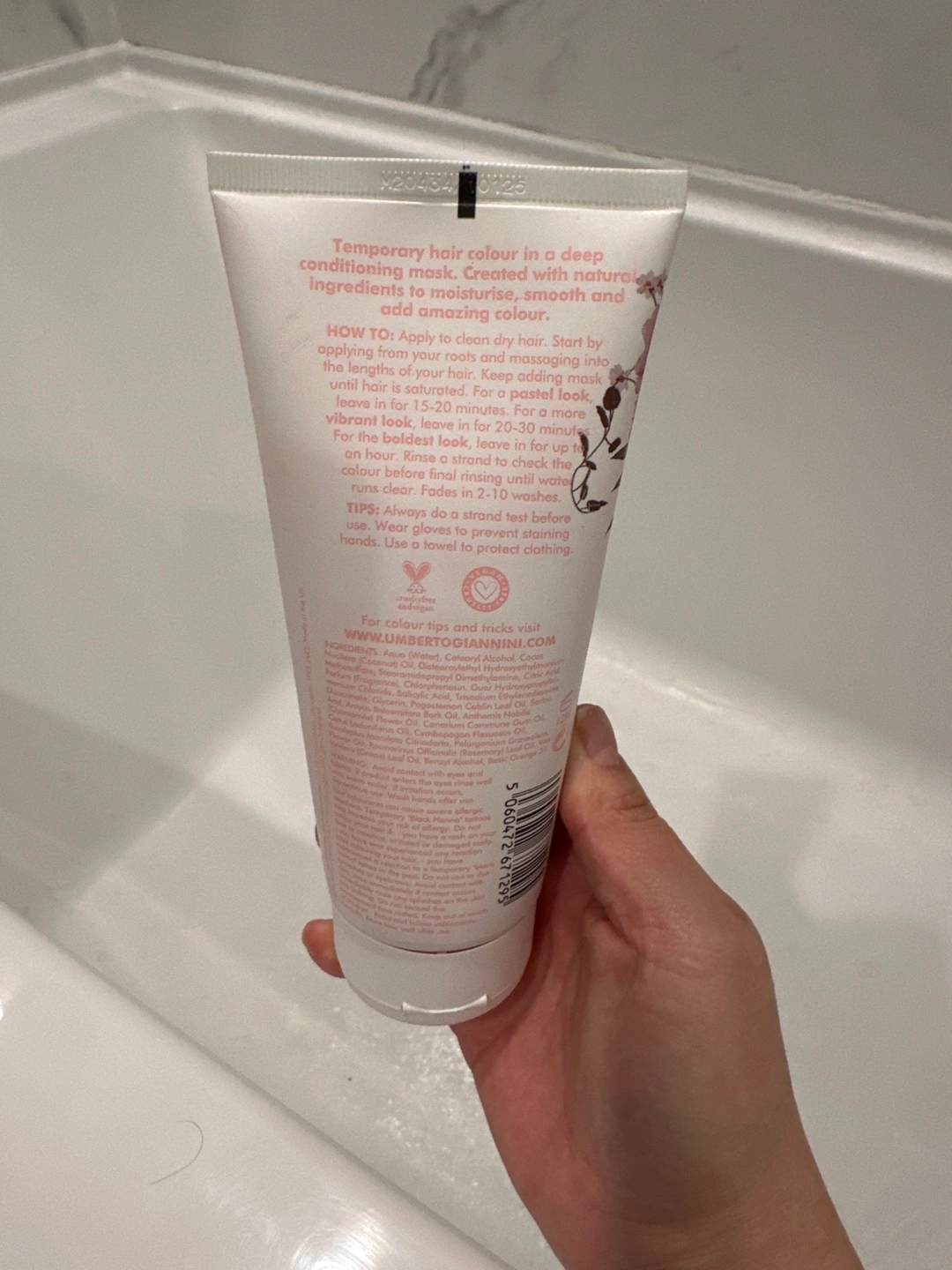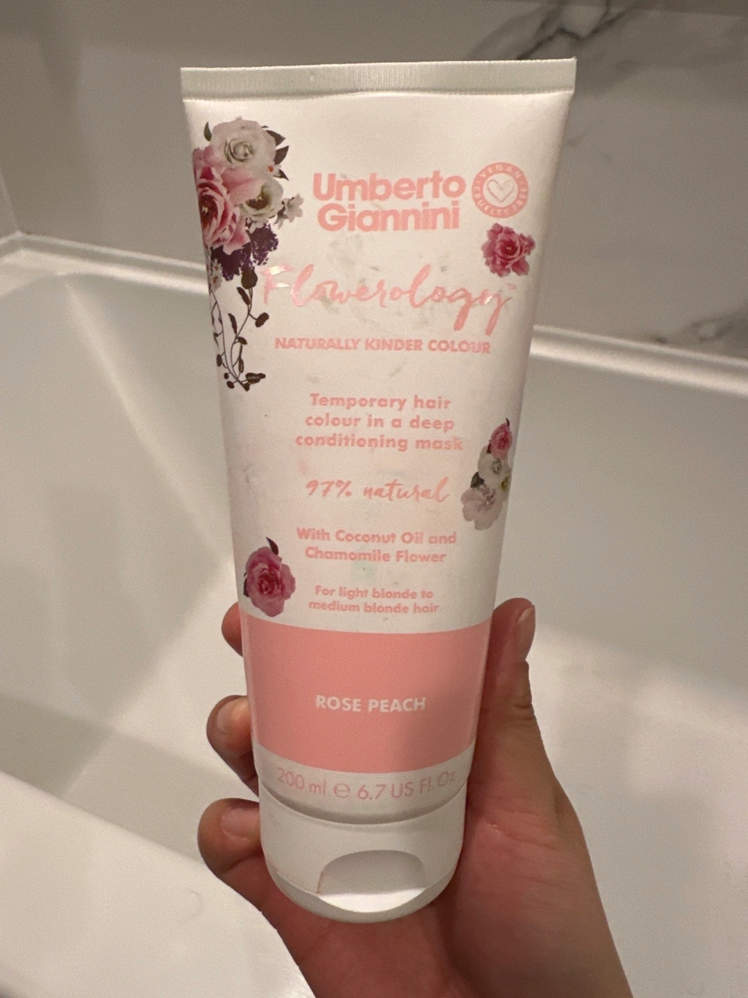 Temporary hair colour in a deep conditioning mask. 97% natural. Rose Peach shade. For light blonde to medium blonde hair. Just opened to see if it worked :) pick up in Brentwood Concord