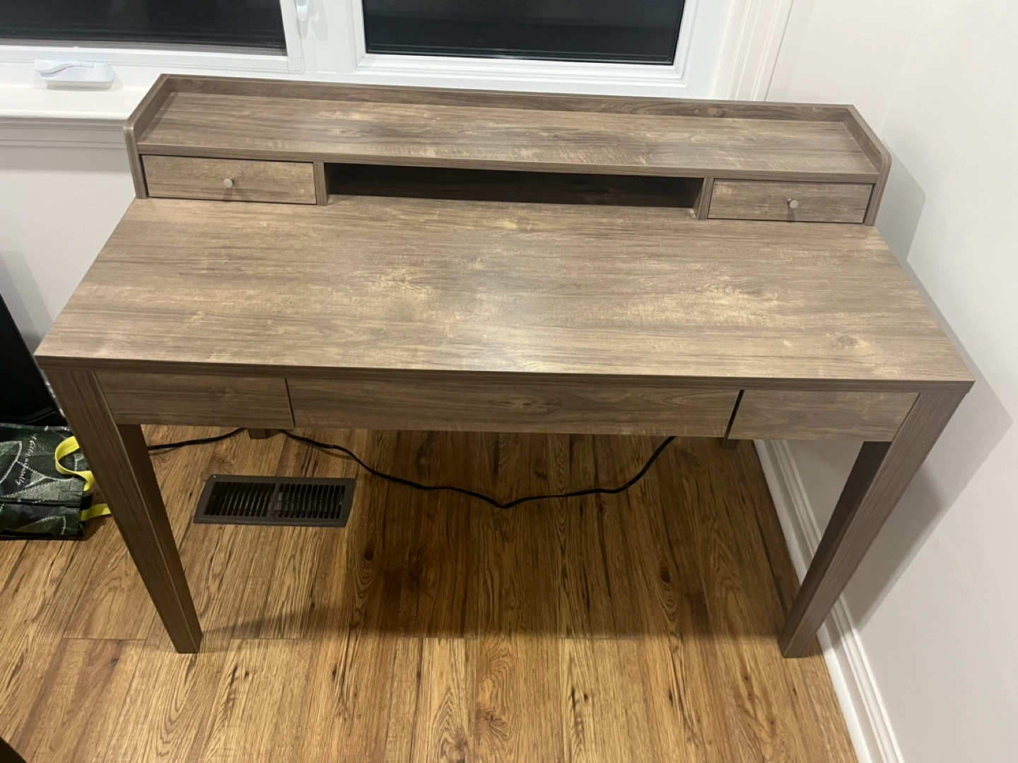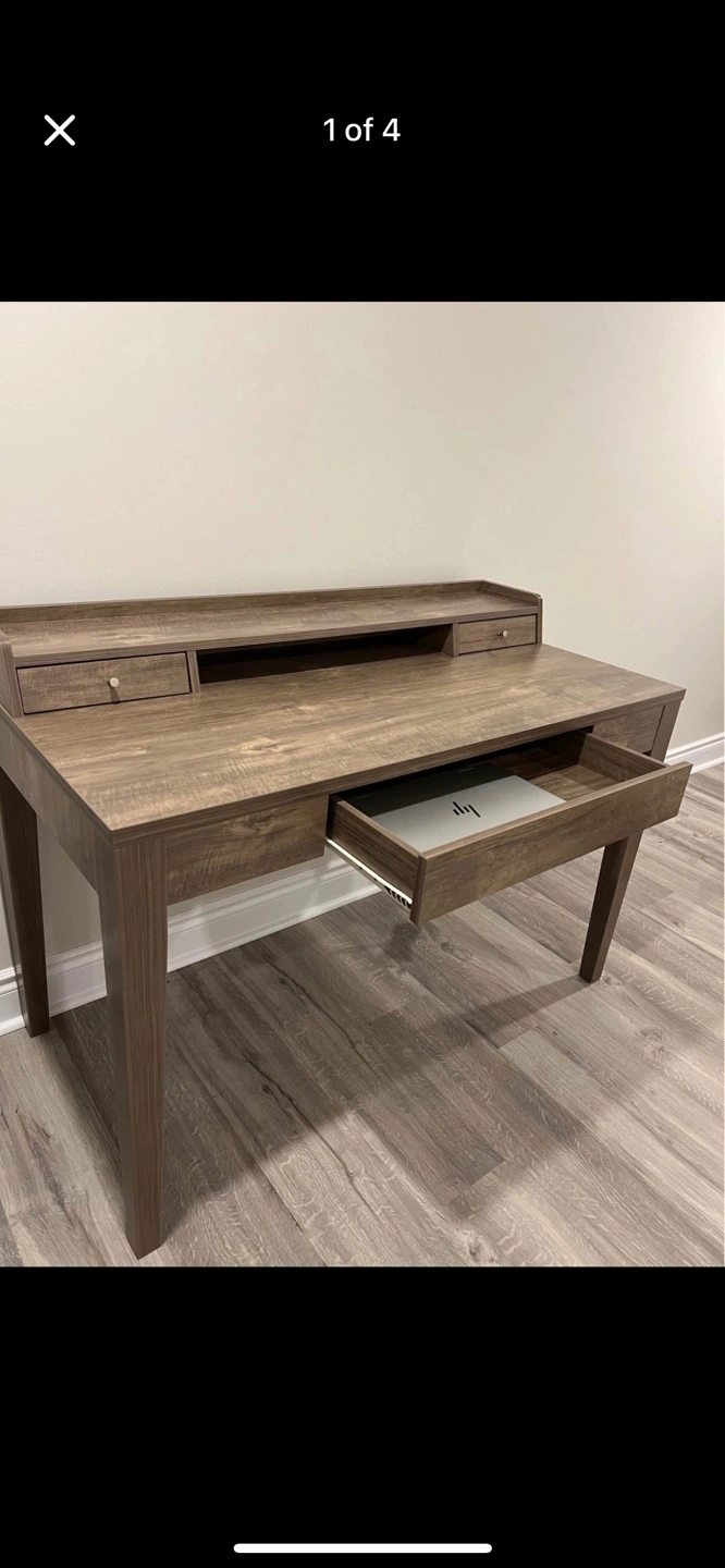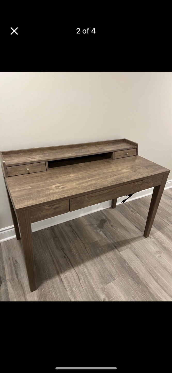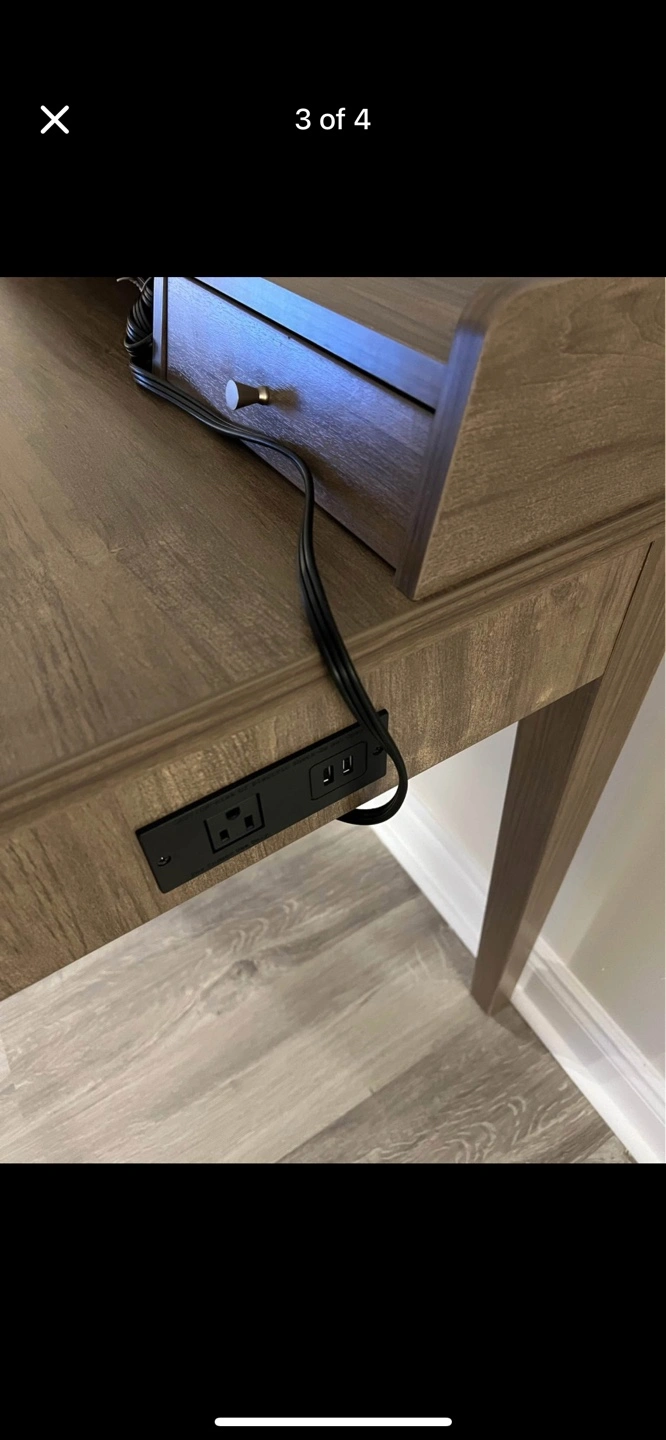 Brown wood-look desk. Features three drawers, two smaller ones above the writing surface and one larger one below. Includes a built-in power bar with outlets and USB ports. Sleek, minimalist design.