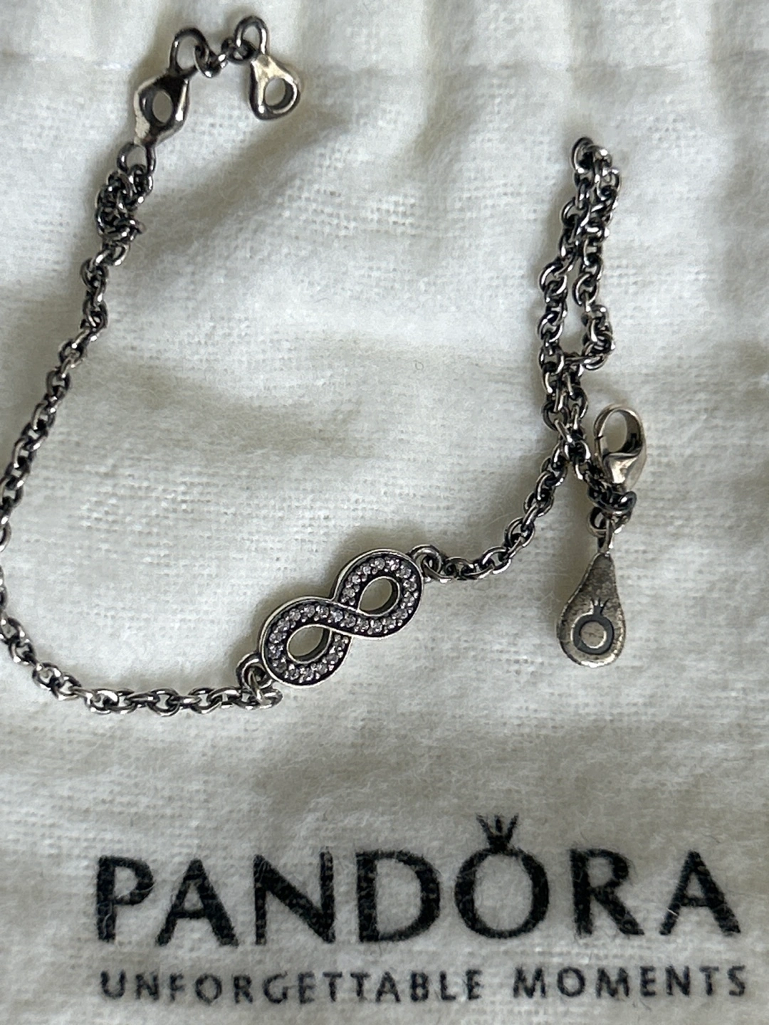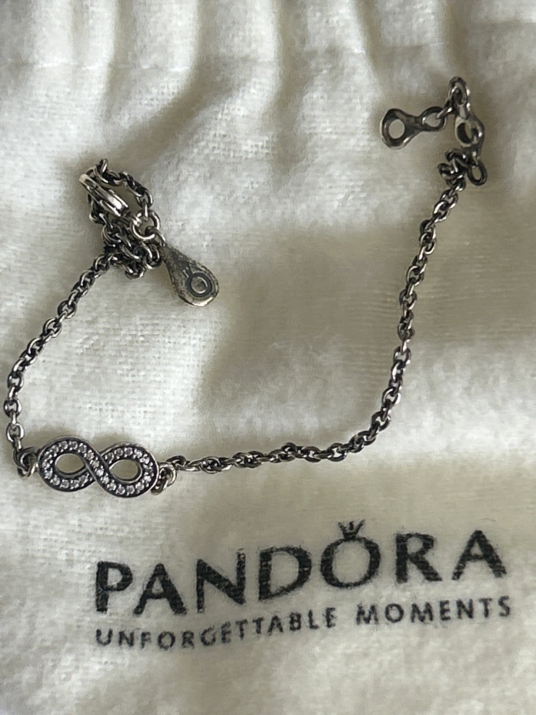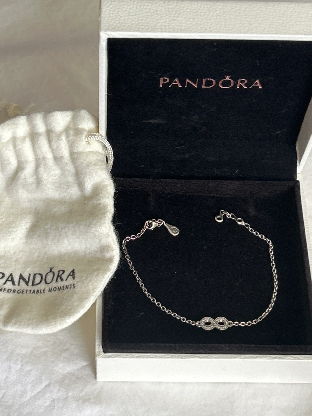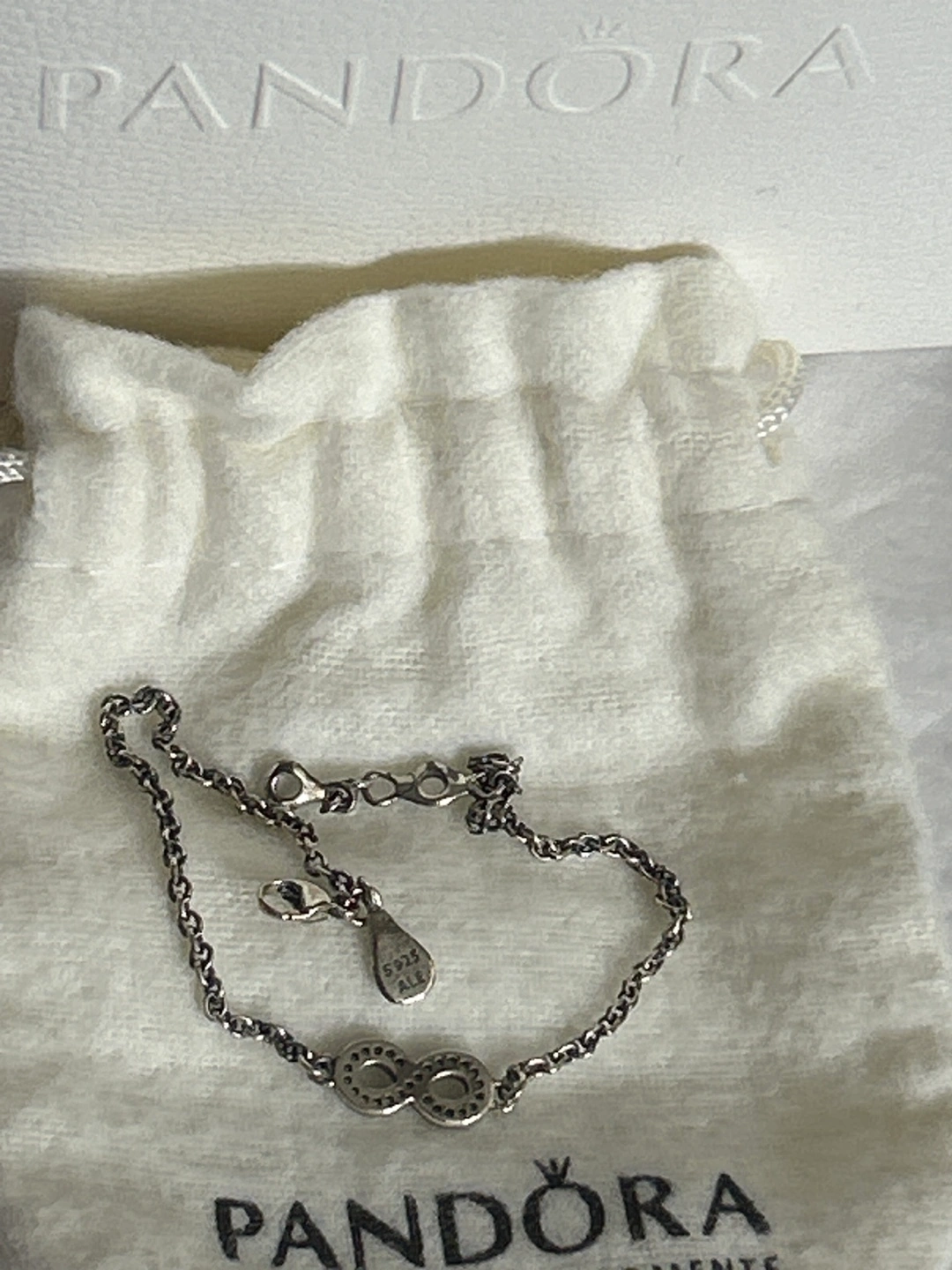 1000+Brand New Pandora infinity bracelet. Sterling silver chain bracelet.Features small clear stones. Comes with Pandora pouch and box. Never worn nor used. Smoke/Pet free home. Cash and pick up only please.
