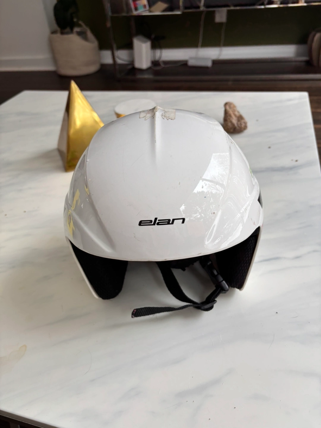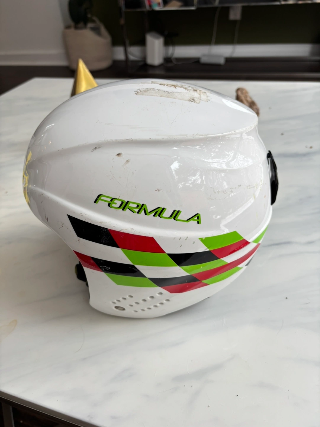 White Elan Formula ski helmet. Features red, black and lime green stripes. Some wear and tear. Good used condition.