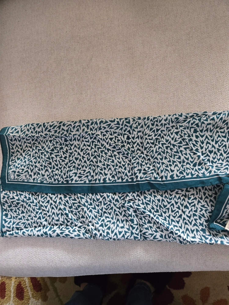 Beautiful silk scarf. Teal and white pattern. Lightweight silk material. Great for adding a touch of elegance to any outfit.