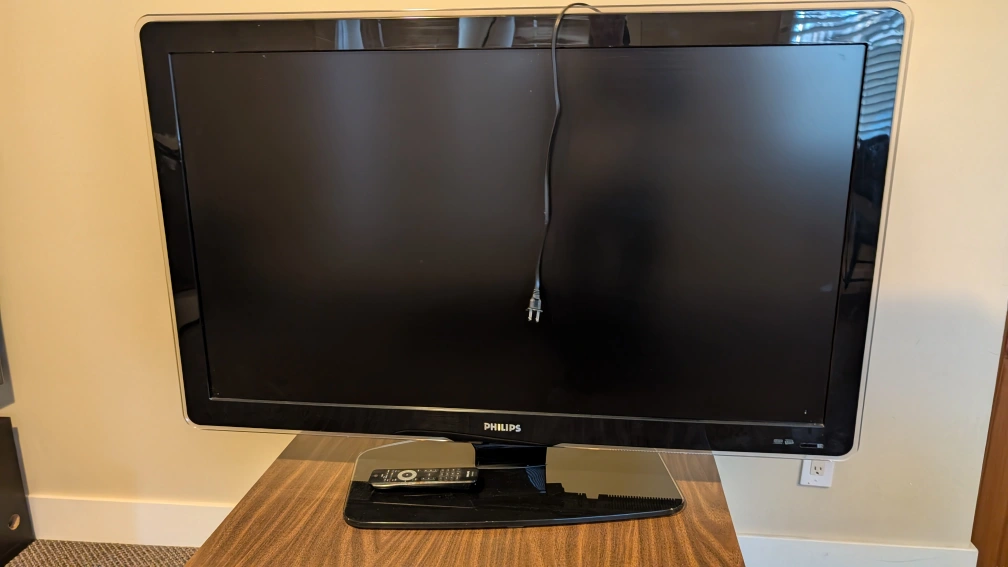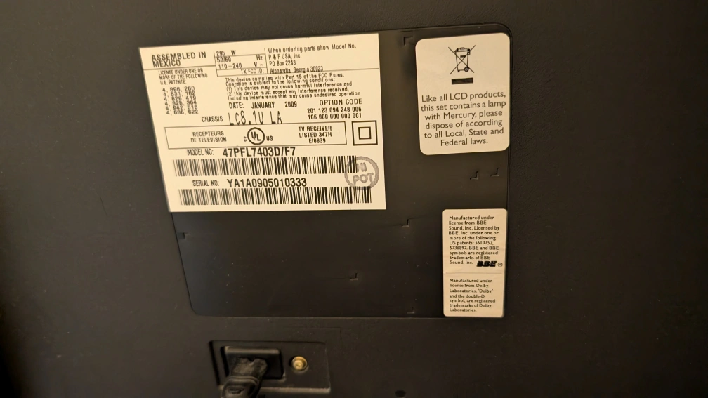 Philips 47-inch LCD HDTV. Model number 47PL4703D. Includes remote control. Features various input ports including HDMI and component video. Great for a secondary TV or home theatre setup.