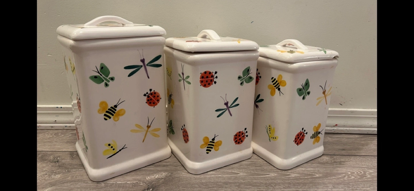 Three ceramic canisters, various sizes. White with colourful insect designs: butterflies, ladybugs, dragonflies, and bees. Square shape with lids.