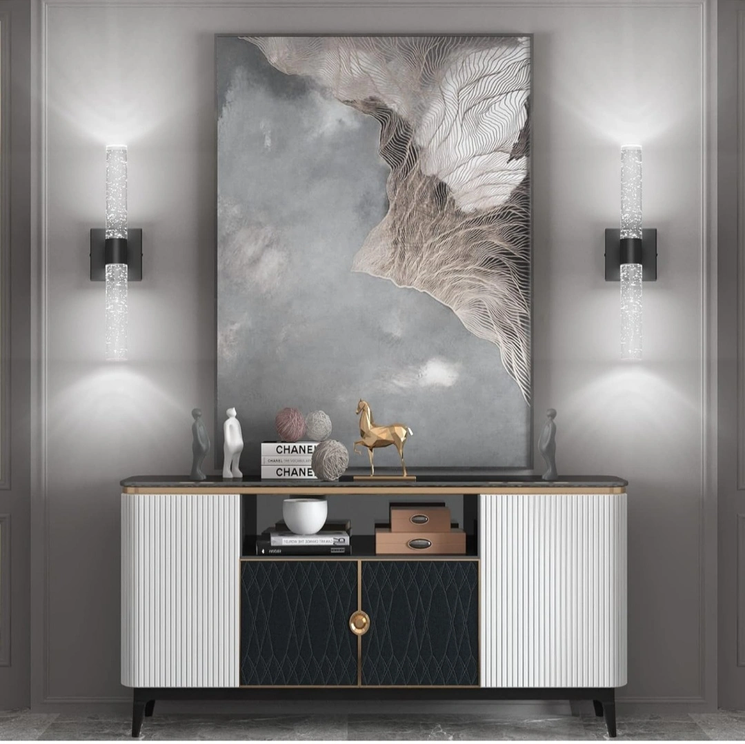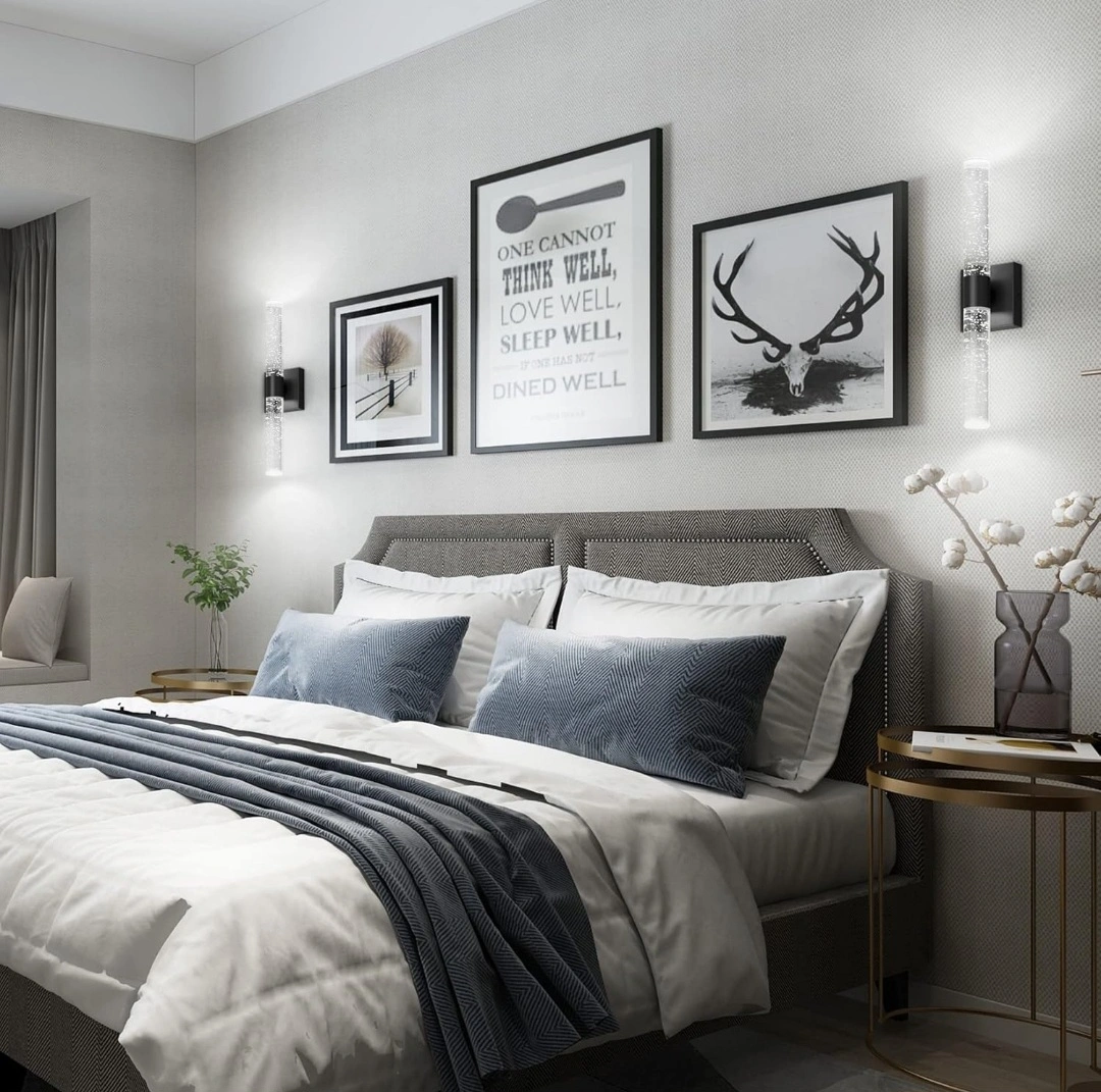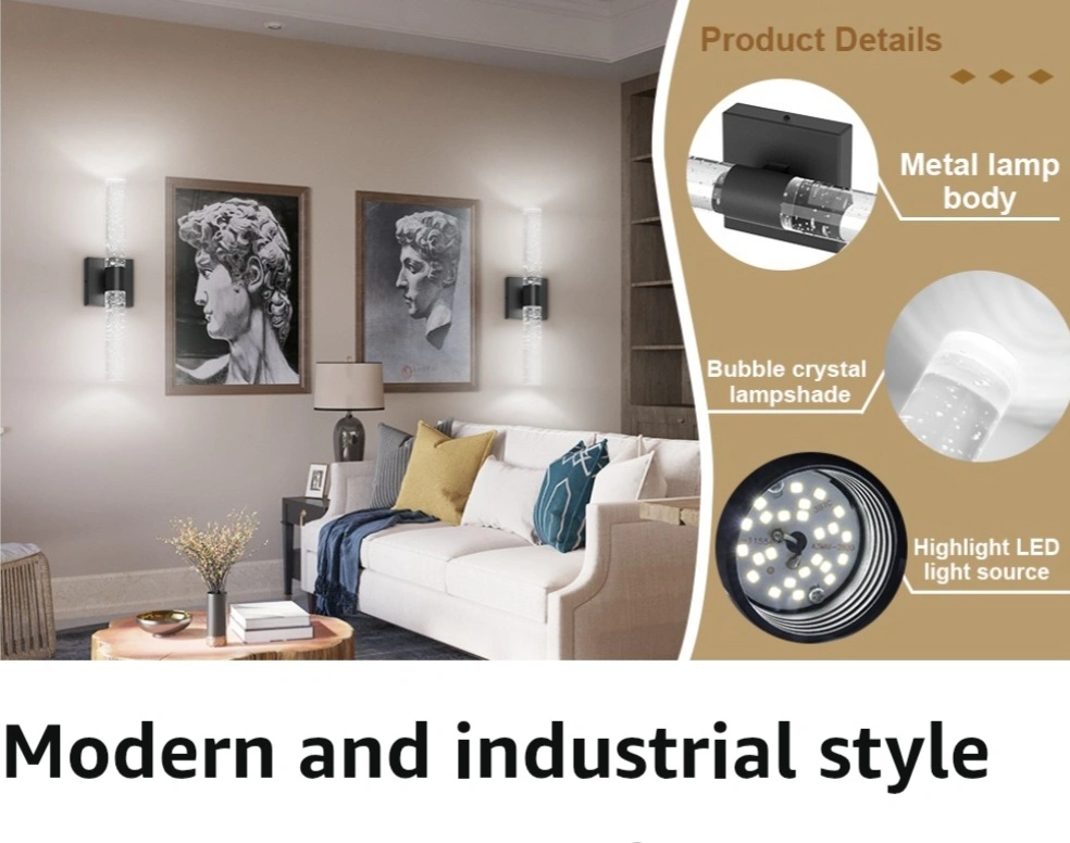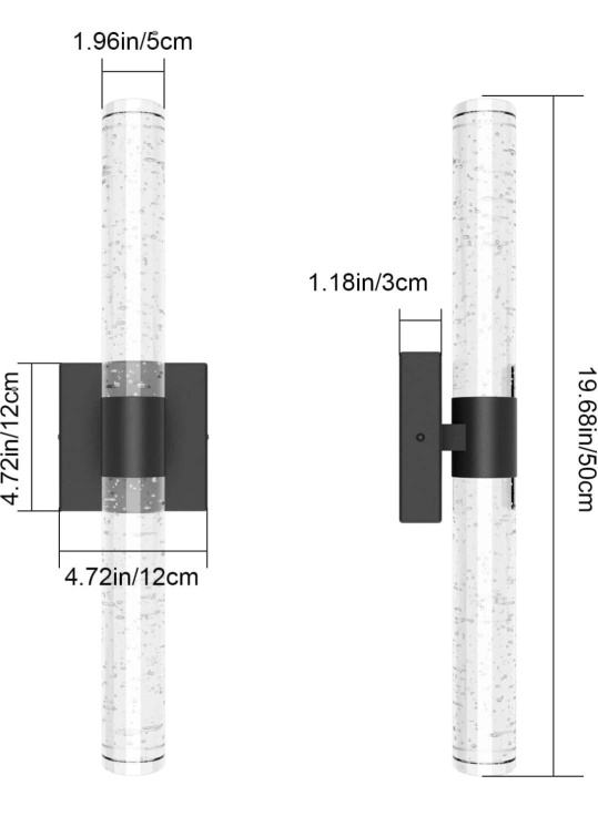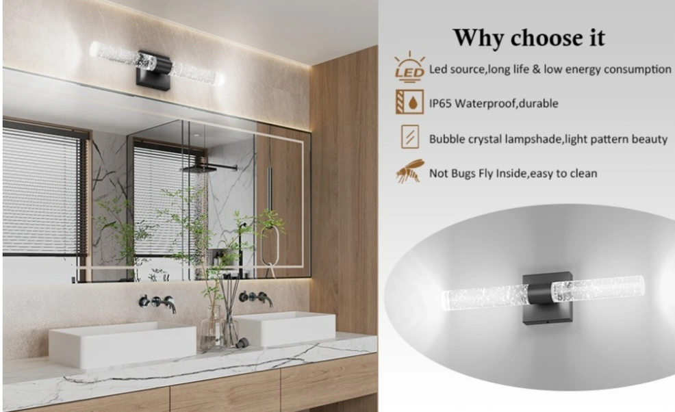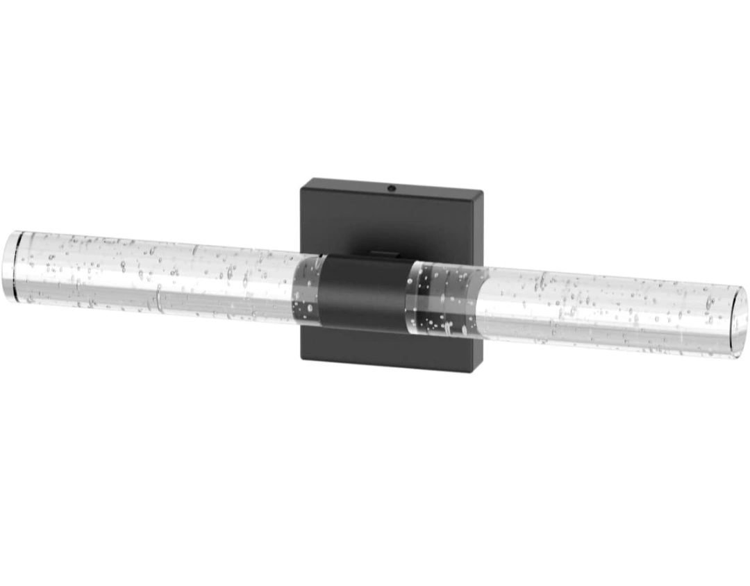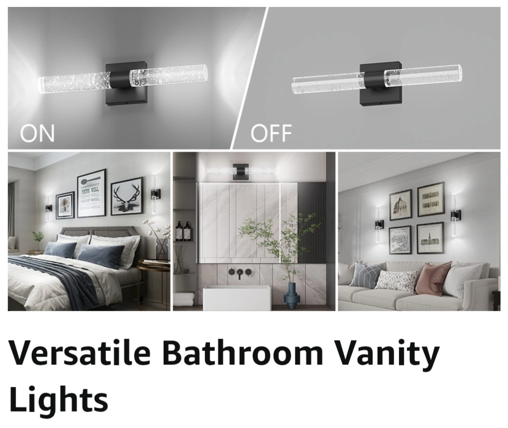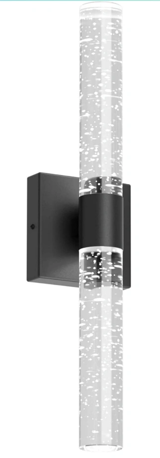 Sleek and stylish LED vanity lights. Perfect for bathrooms, bedrooms, or hallways. Features a clear bubble glass tube and black metal base. Easy installation. Adds a touch of elegance to any space.