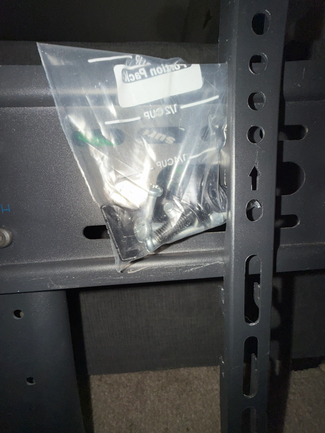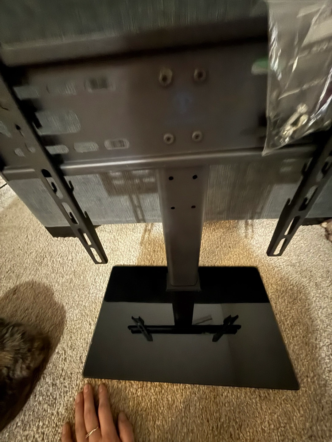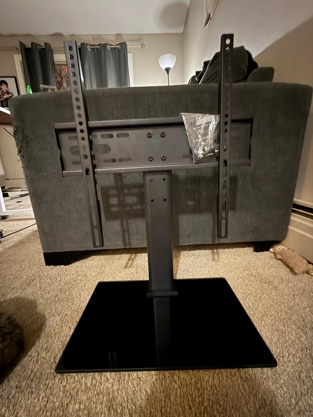 Black glassTV stand with mount. Includes mounting hardware. Suitable for smaller to medium-sized TVs up to 50 inch
