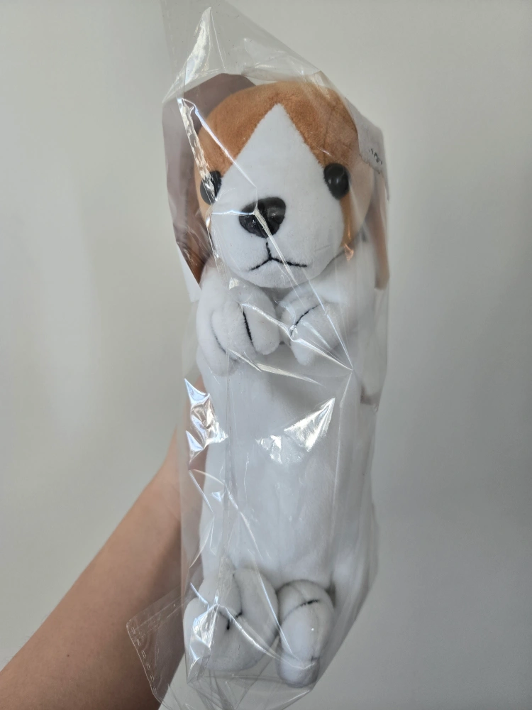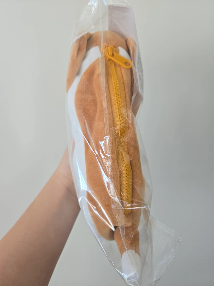 Cute beagle-shaped pencil case. Soft plush material. Yellow zipper. Perfect for stationery or small items.