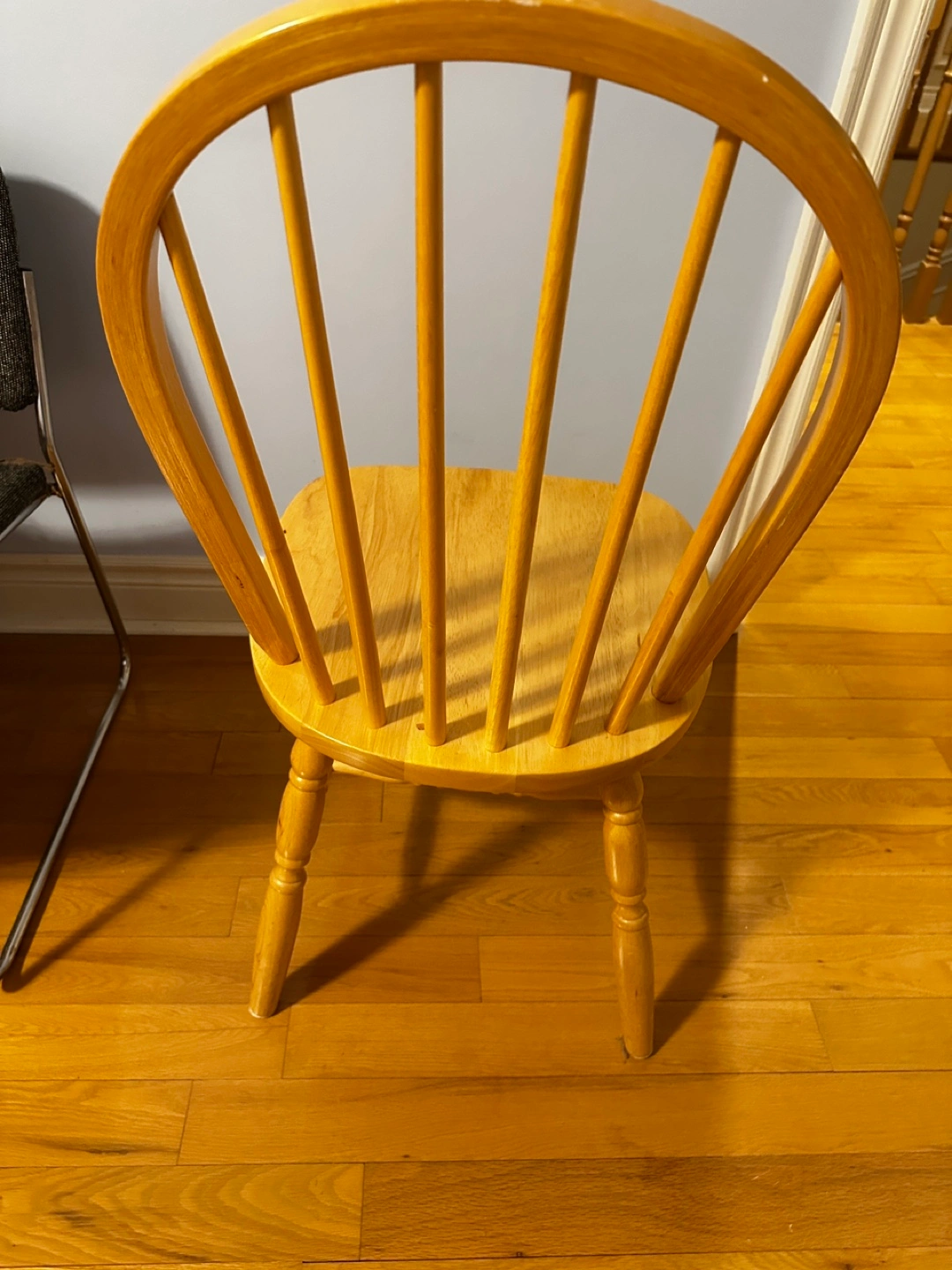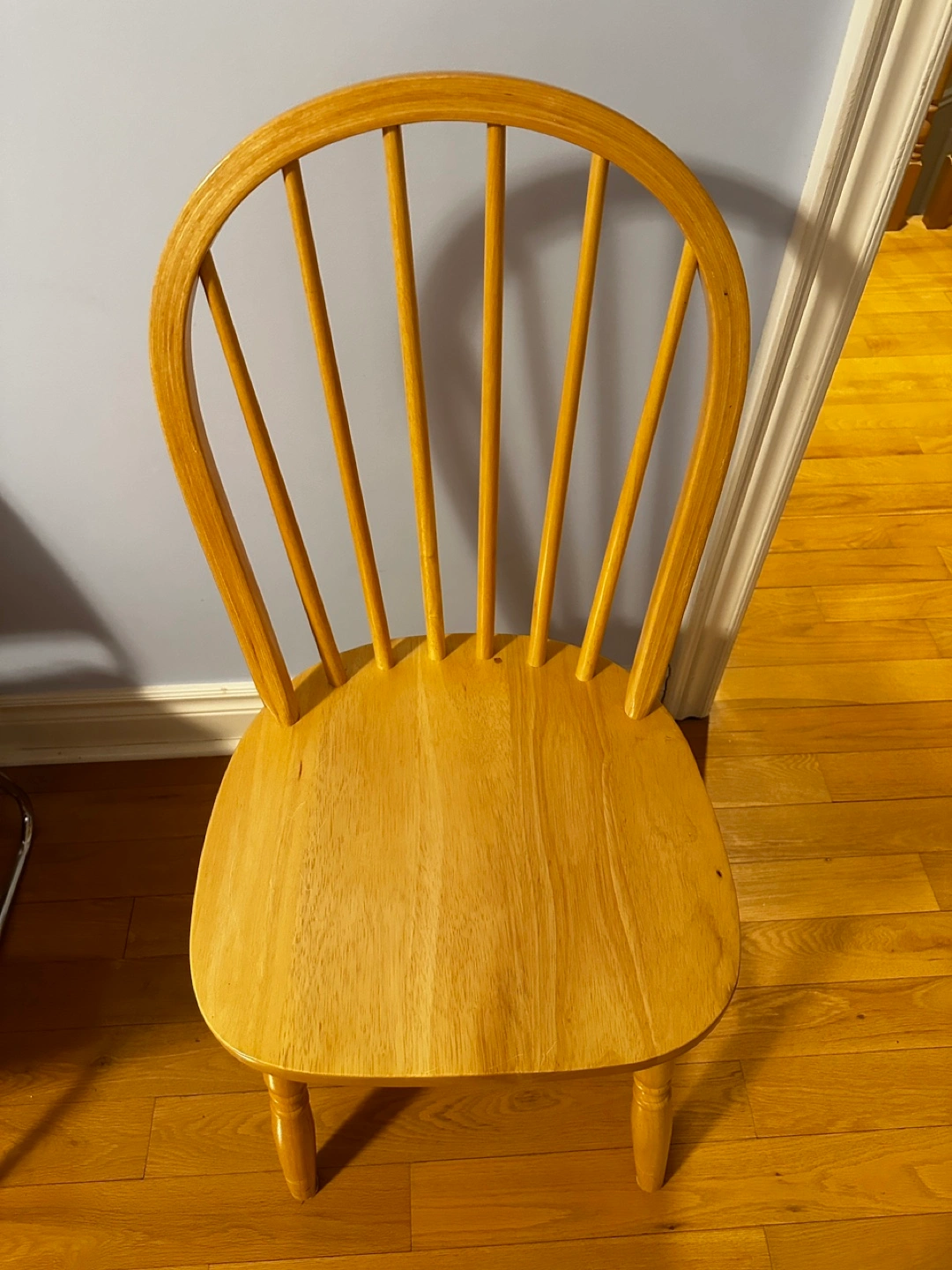 Solid wood chair. Light coloured wood finish. Simple design. Suitable for kitchen or dining room. Good condition.