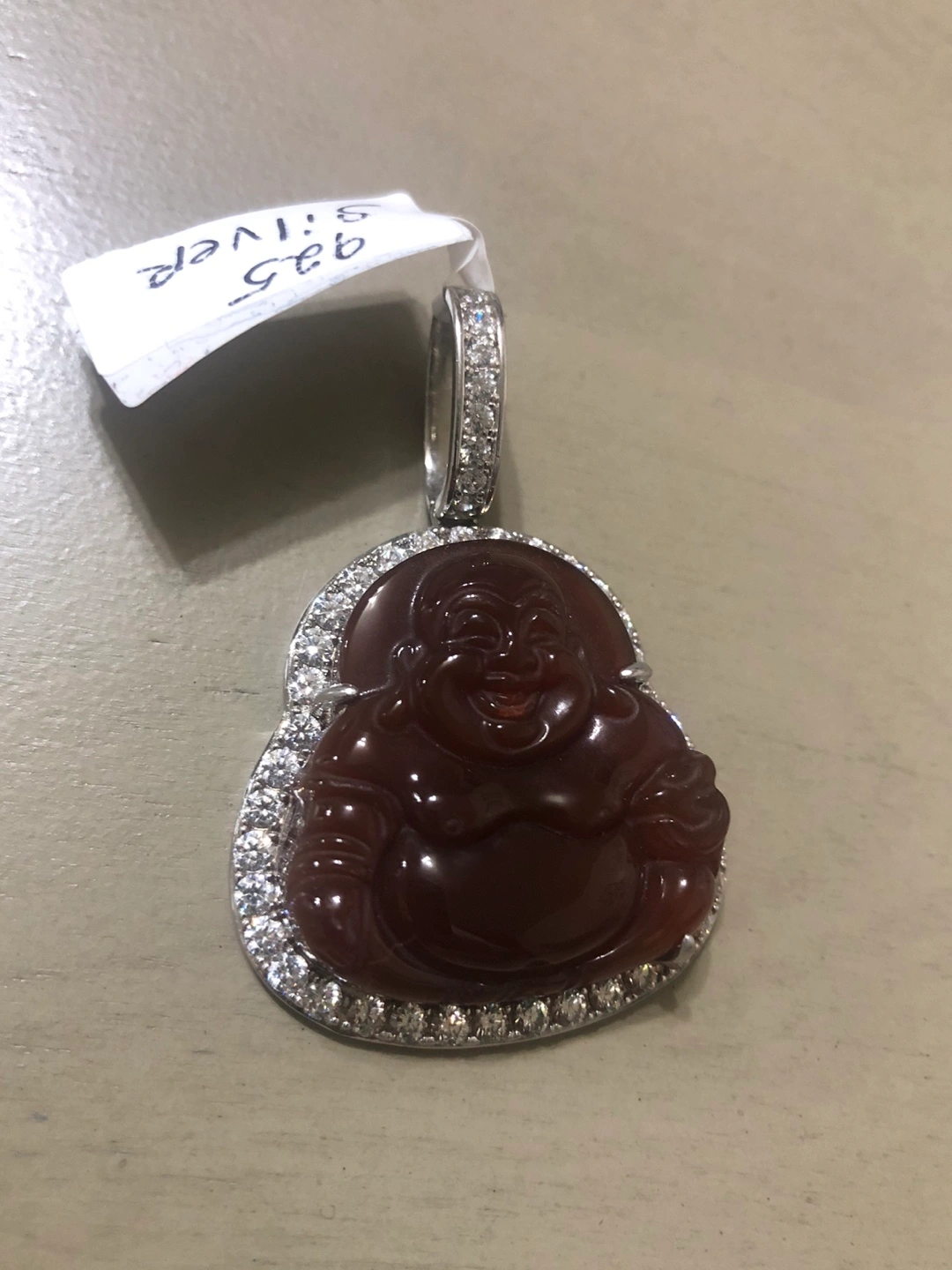 23Stunning Laughing Buddha pendant. Features a dark red stone, framed by a halo of small diamonds. Silver bail. Unique and eye-catching piece.