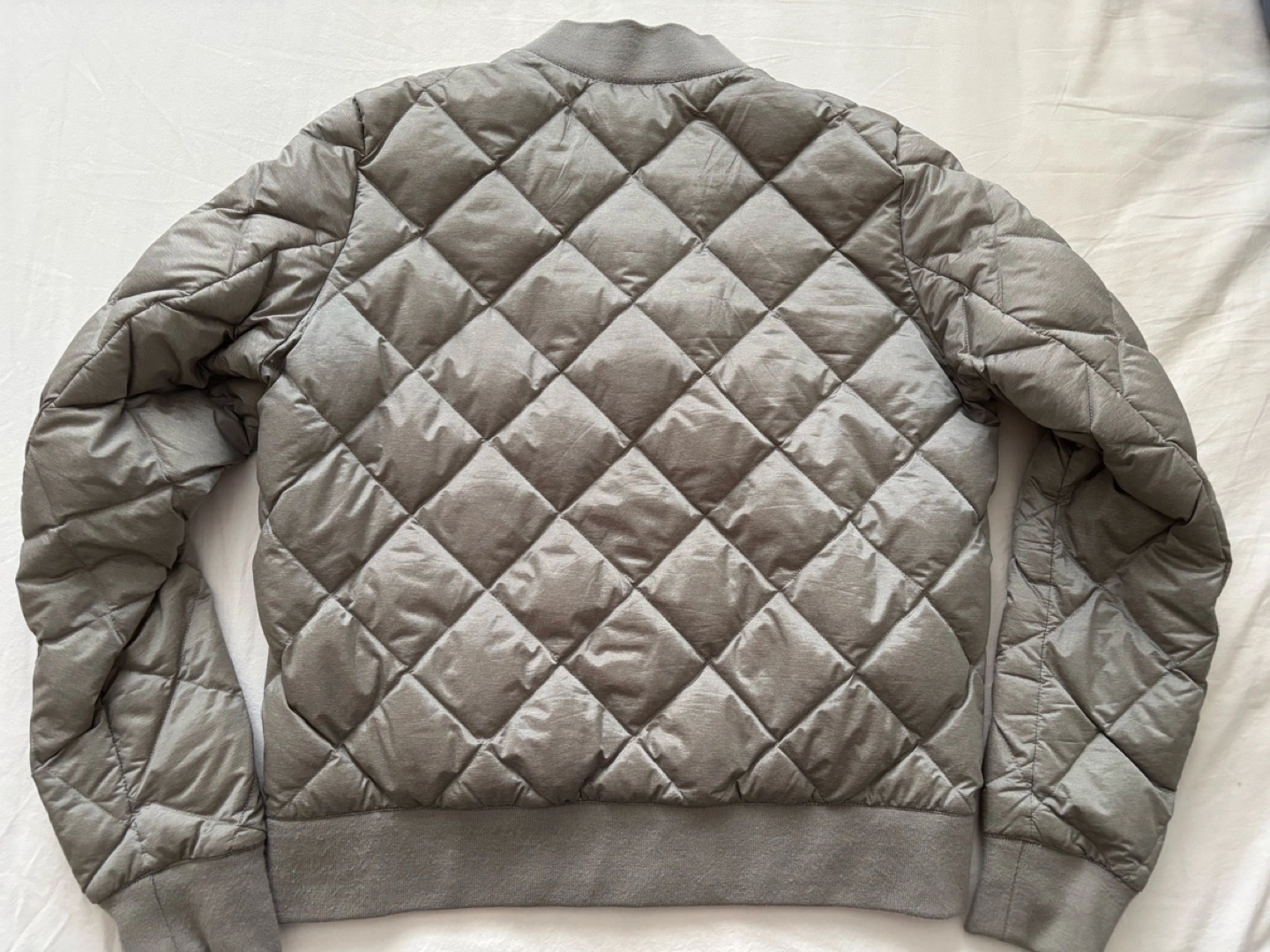Women's UNIQLO down-filled bomber jacket. Grey colour. Quilted diamond pattern. Size small. Zip front closure. Long sleeves. Ribbed cuffs and hem. 90% down.