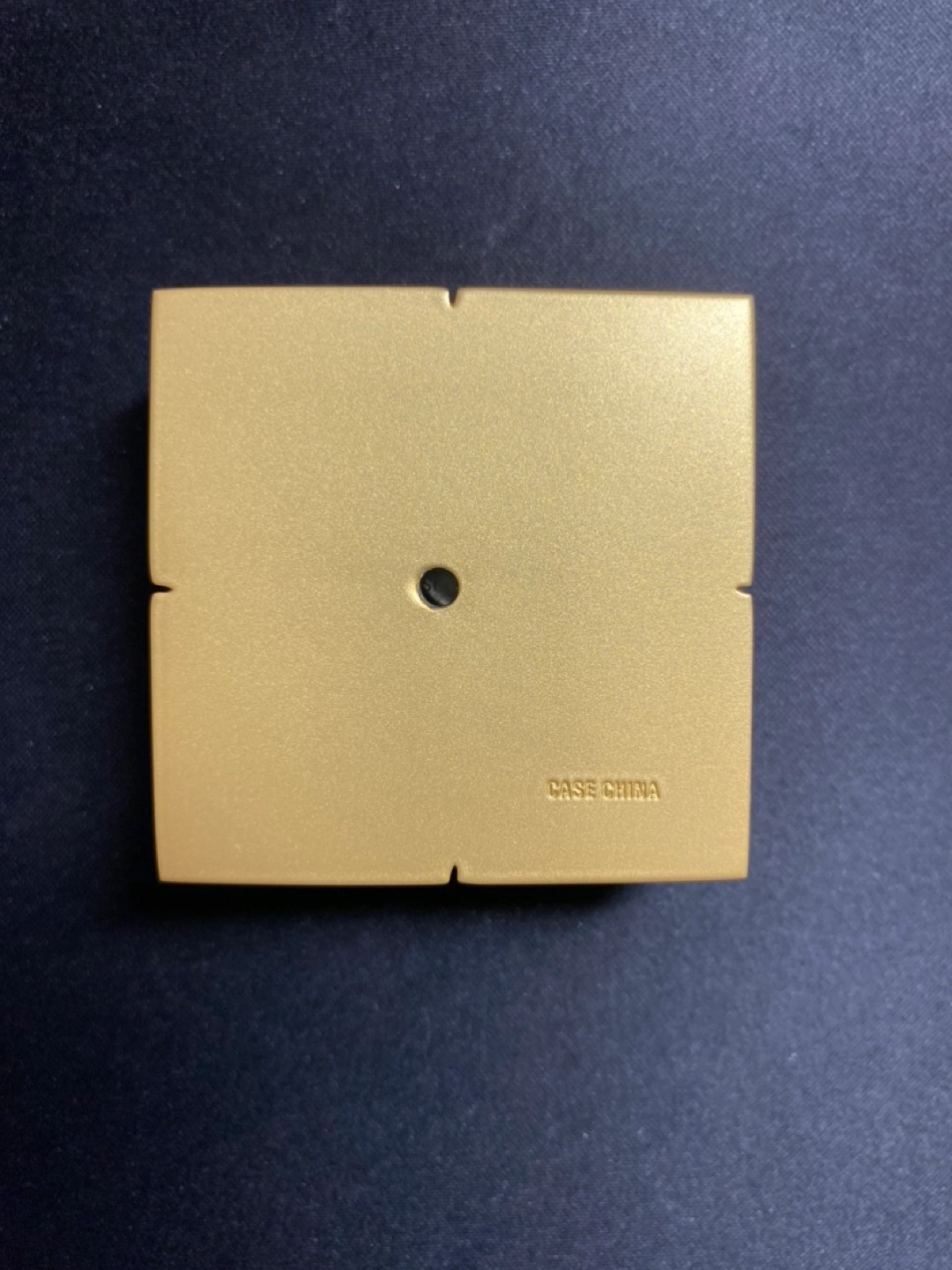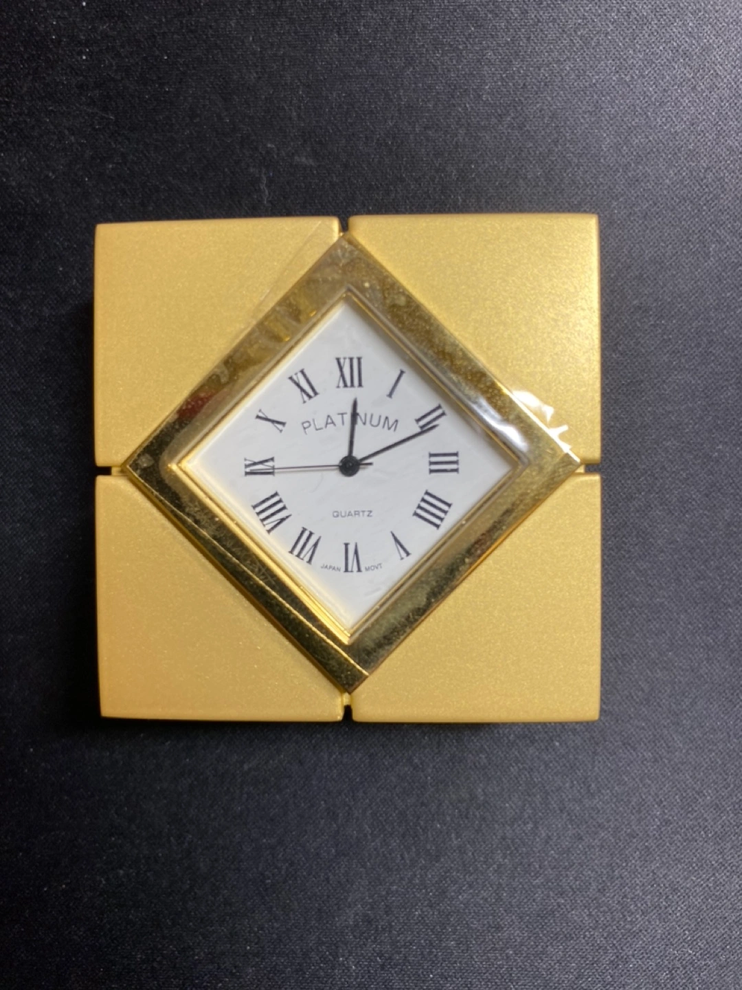 Small gold desk clock. Square shape. Quartz movement. Made in Japan. Unique design. All it needs is a battery.