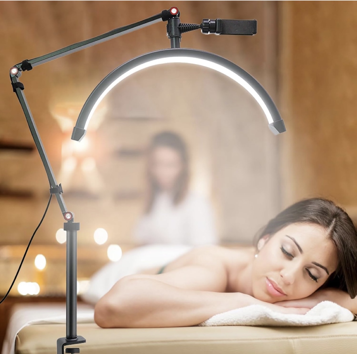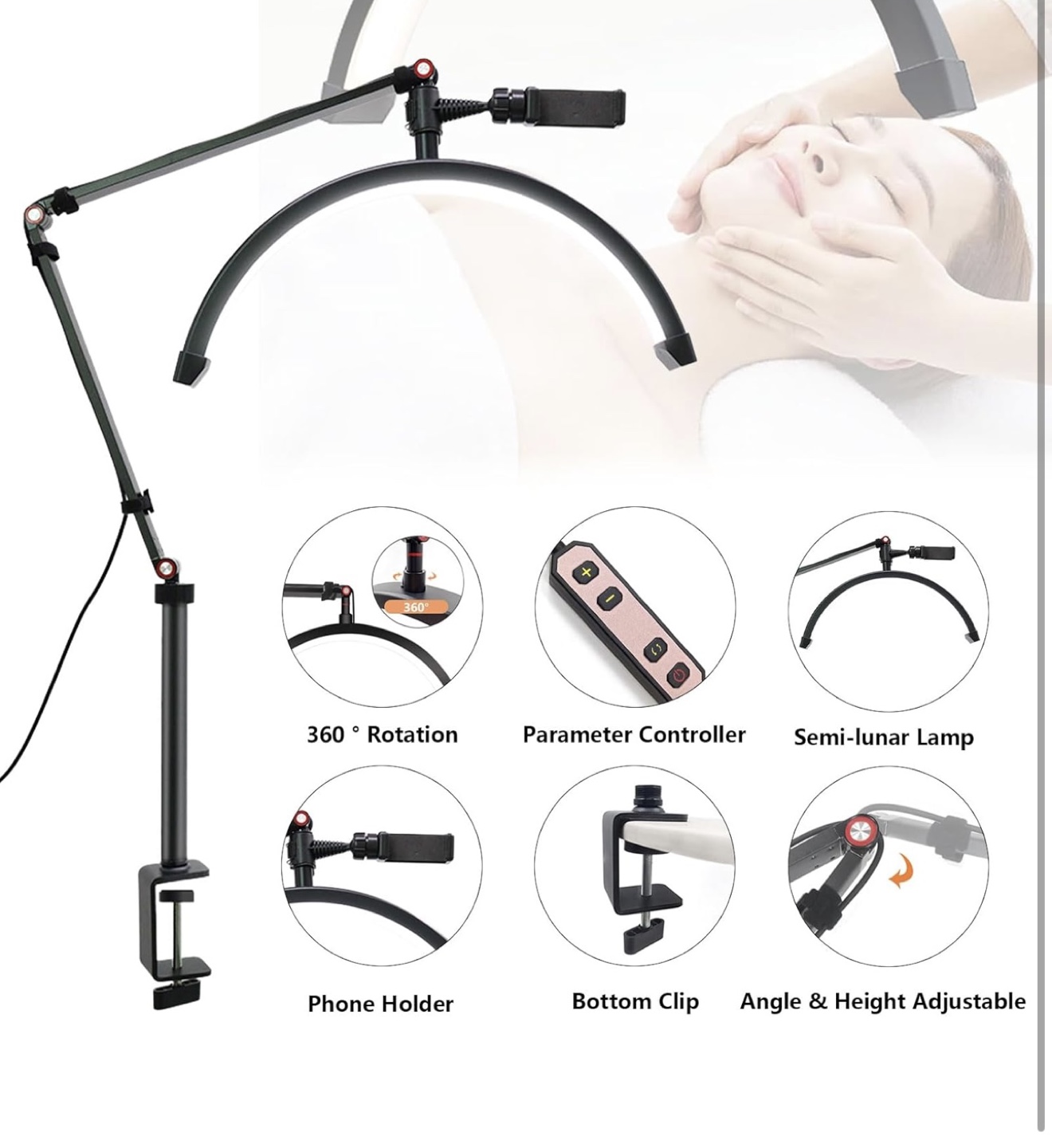 Versatile ring light, adjustable height and angle. 360° rotation. Clamp base for easy attachment. Great for beauty applications or videography.