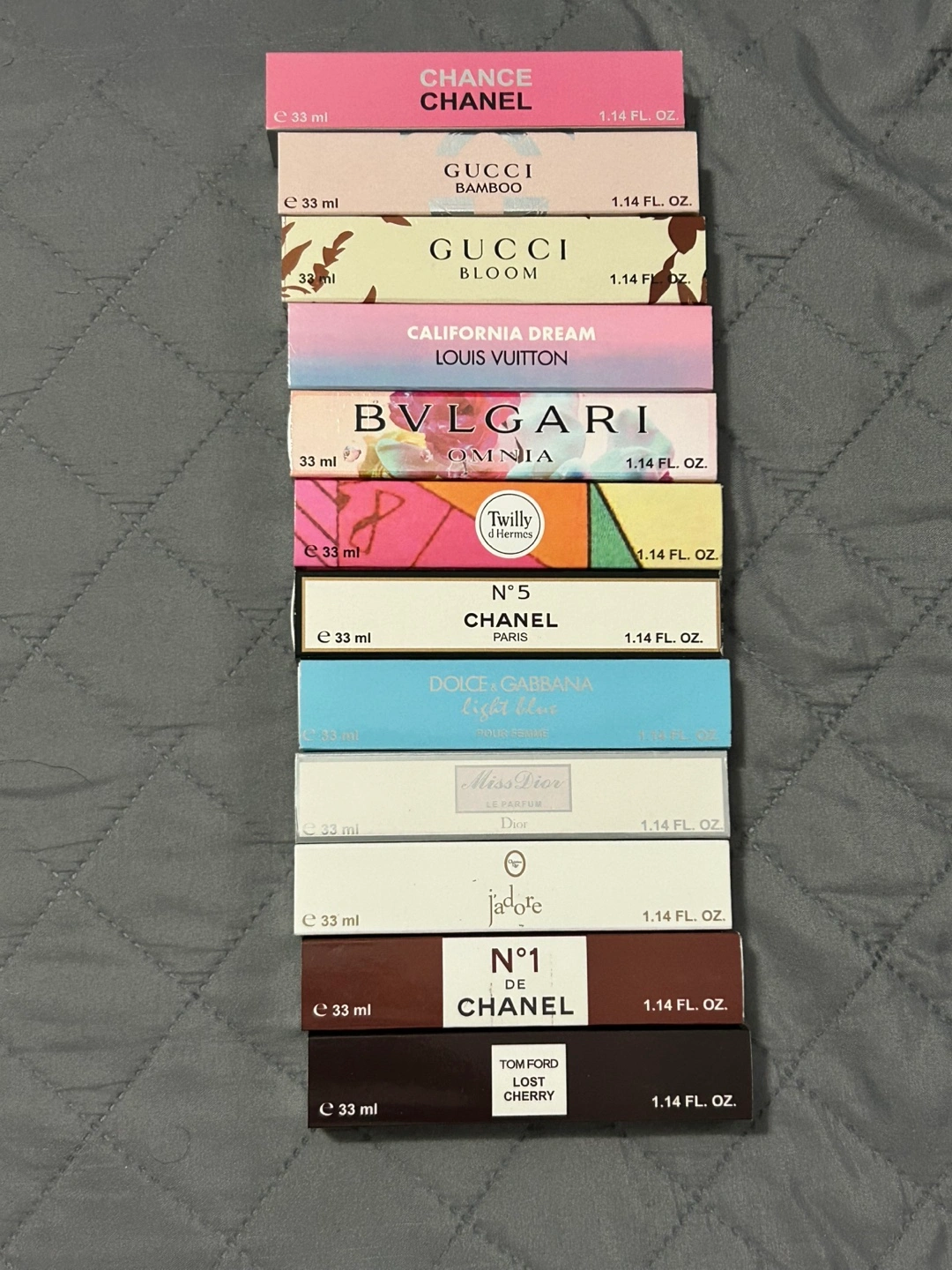 Collection of various designer perfume miniatures. Includes Chance Chanel, Gucci Bamboo, Gucci Bloom, California Dream Louis Vuitton, Bvlgari Omnia, Twilly d'Hermes, Chanel No 5, Dolce & Gabbana Light Blue, Miss Dior, Dior J'adore, Chanel No 1, and Tom Ford Lost Cherry. Each is 33ml or 1.14 fl oz.