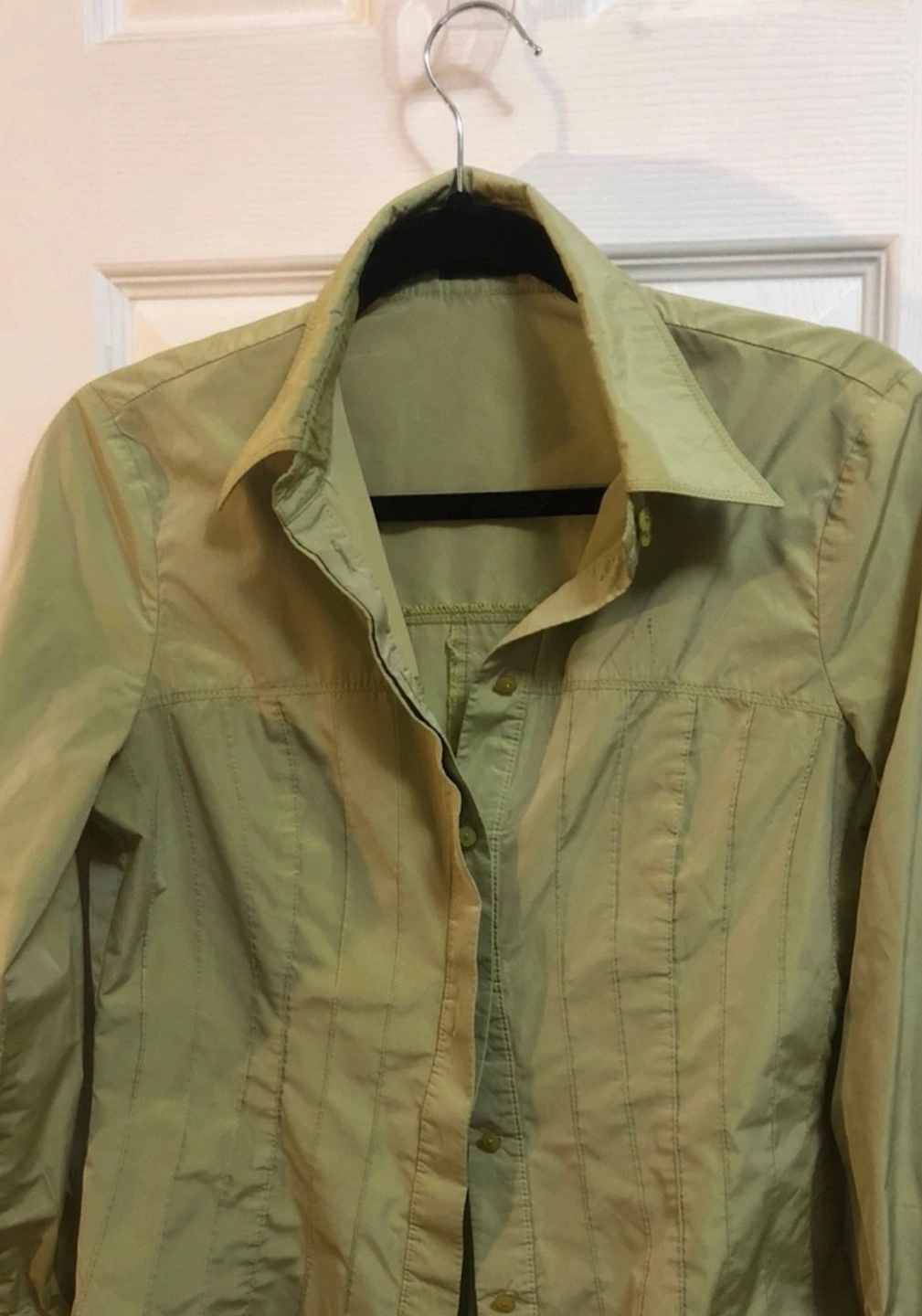 Long-sleeved button-down shirt. Light green colour. Pleated detail down the back and front. Size M. Made in Germany.
