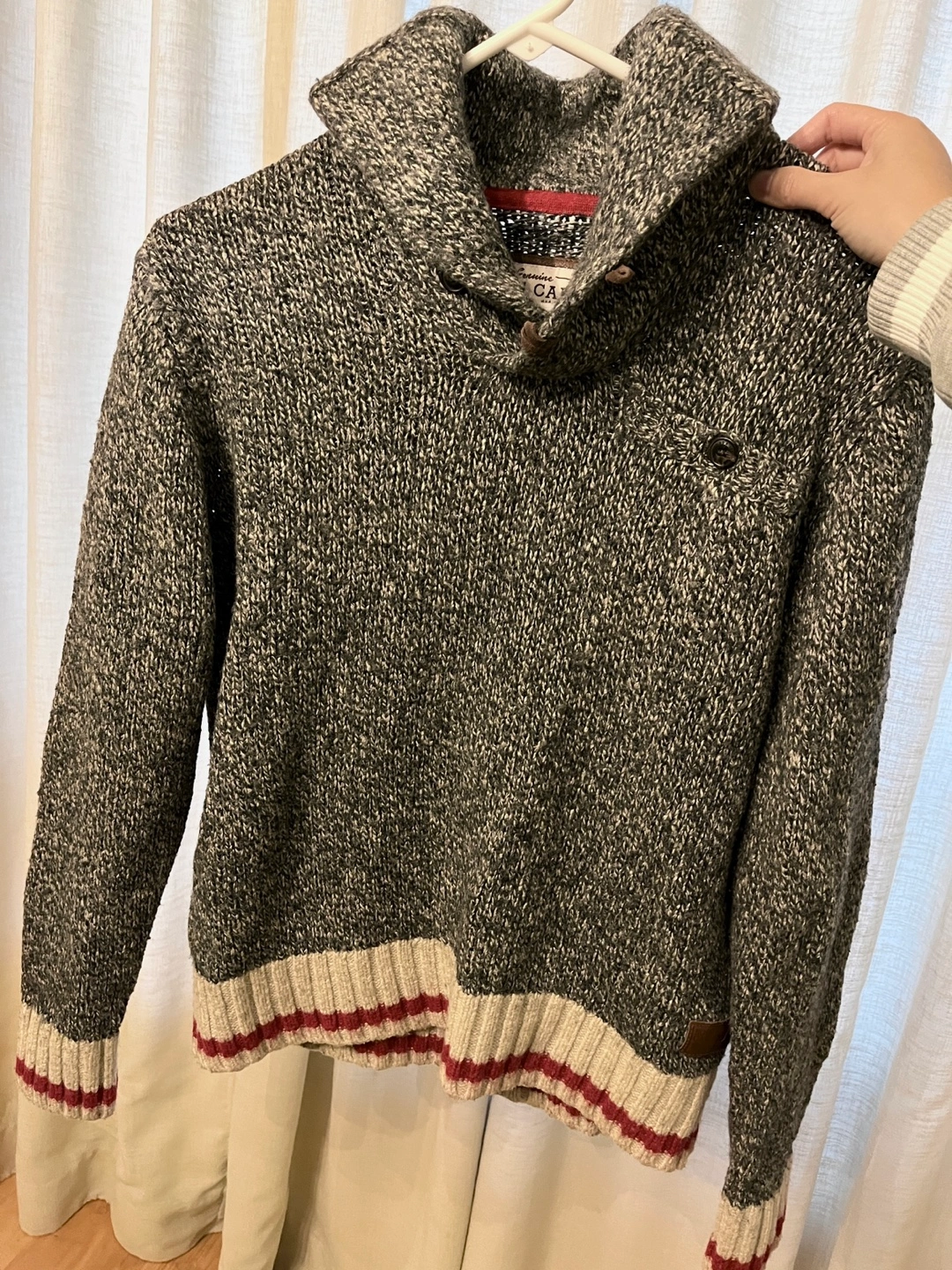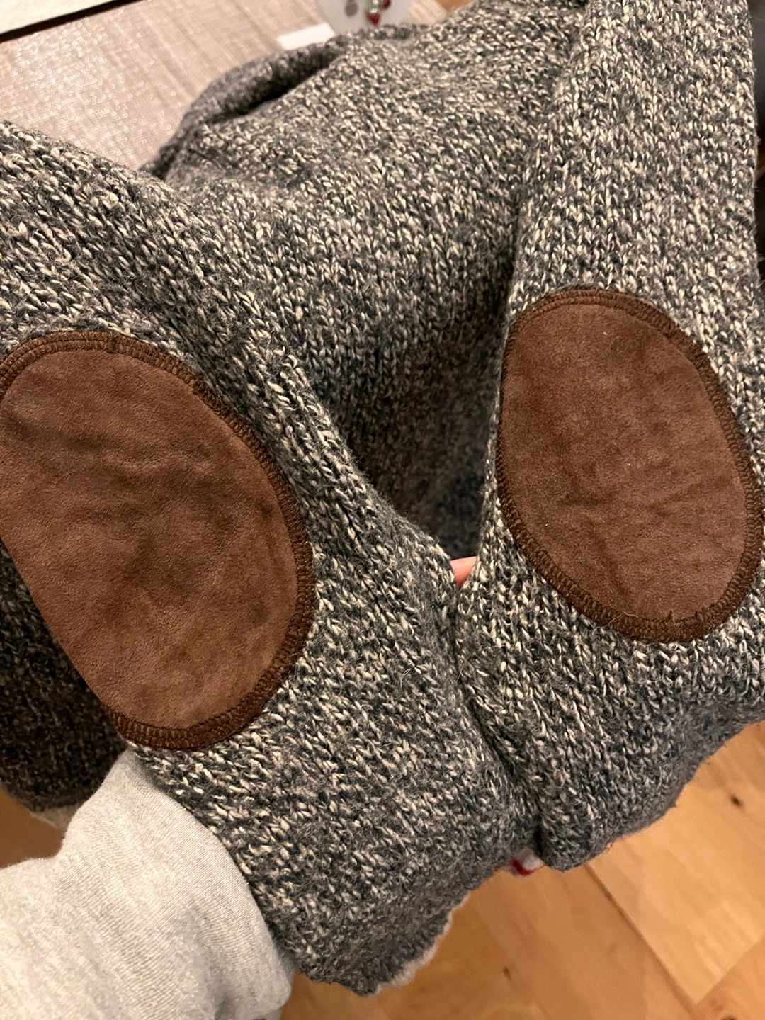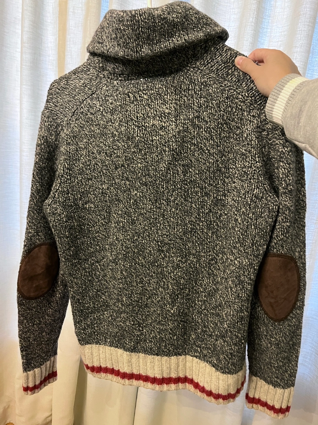 Grey and white wool blend sweater. Features a mock neck, elbow patches, and a contrasting ribbed hem. Size medium.