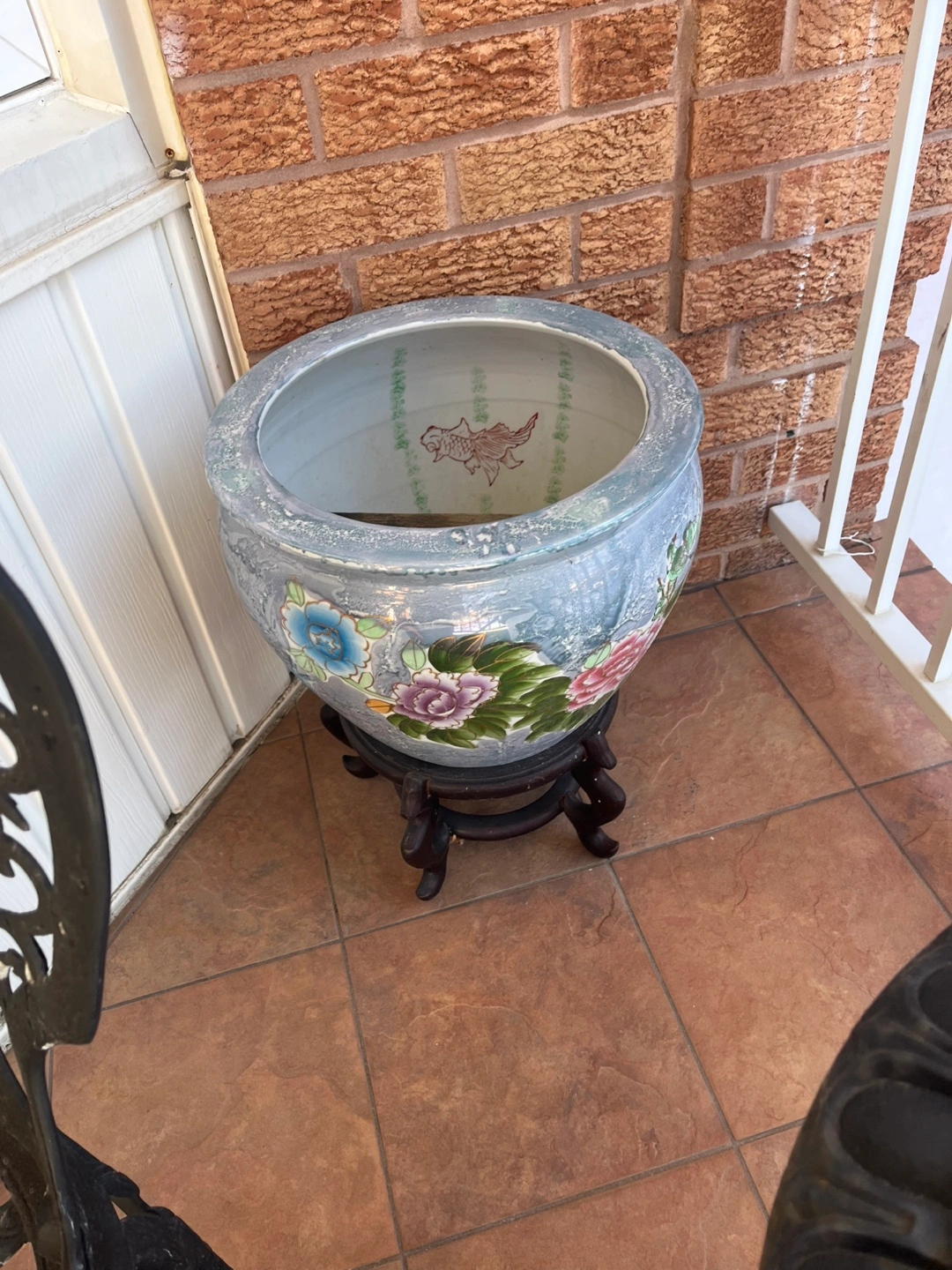 Beautiful large ceramic planter. Features floral and fish designs. Comes with a dark wood stand. Perfect for indoor or outdoor use.