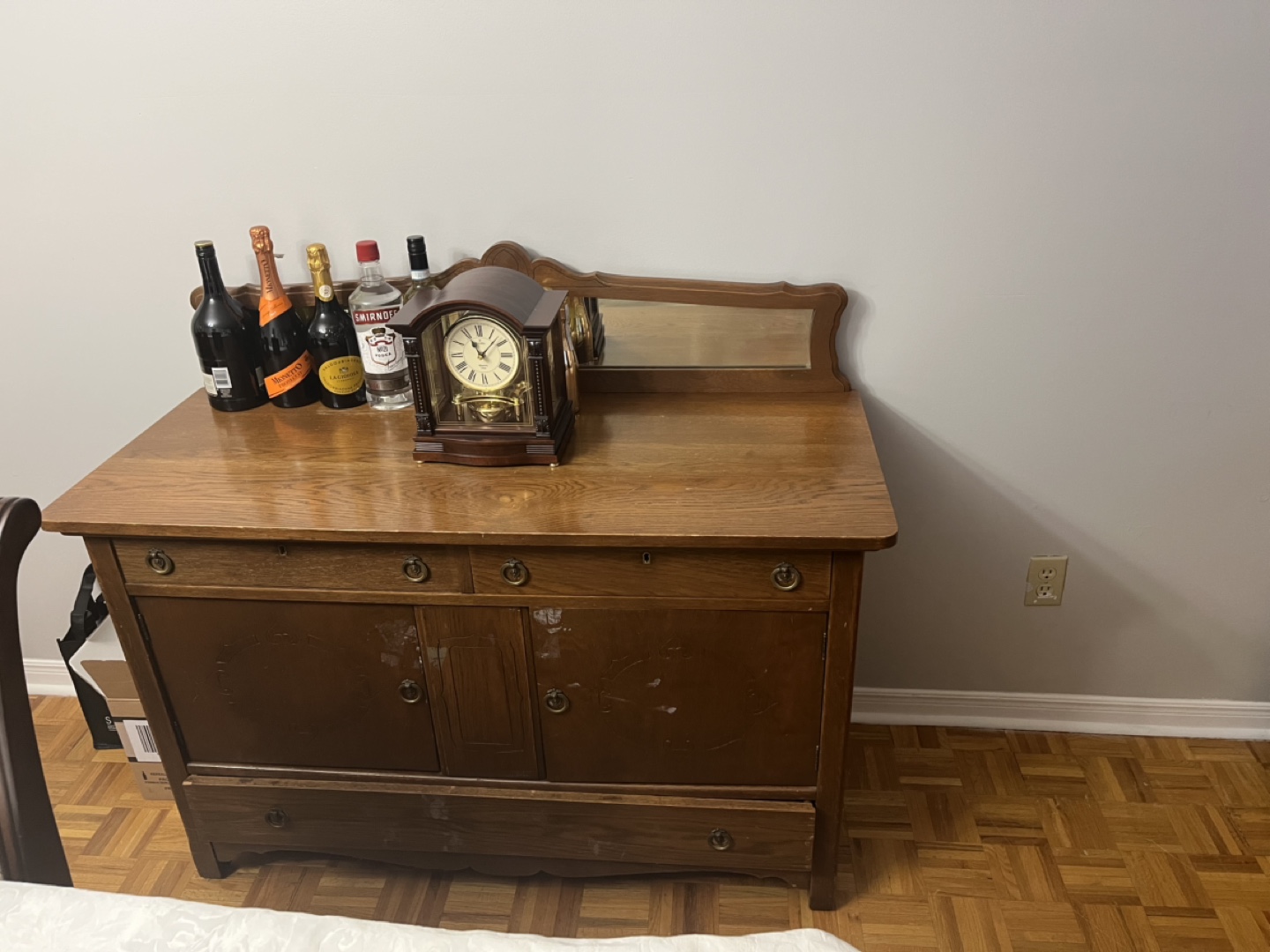 Vintage wooden buffet server. Features three drawers and two doors. Mirror included. Some minor surface wear.