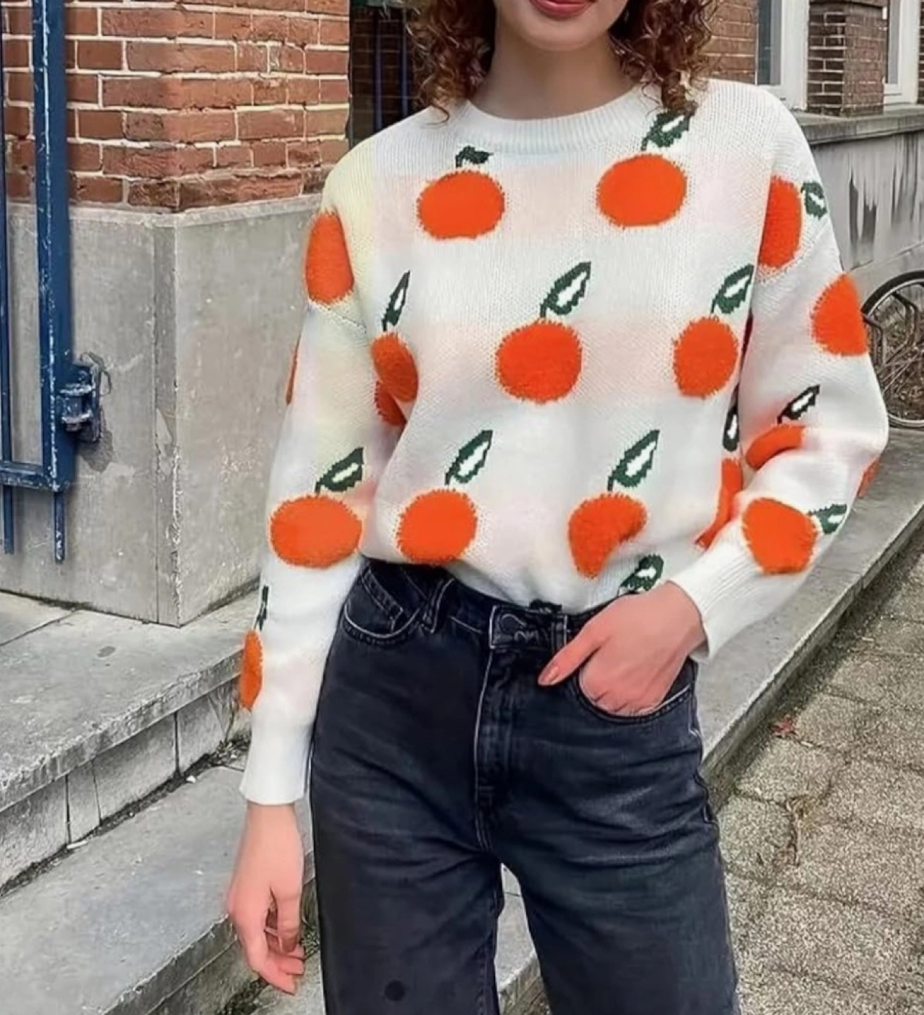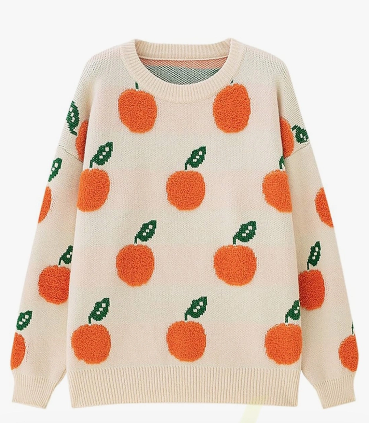 Cream-colored sweater with an orange fruit print. Long sleeves. Crew neck.